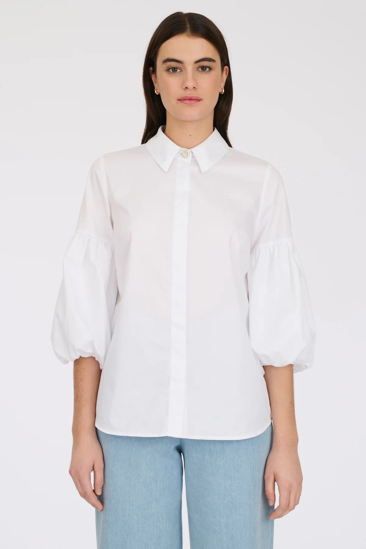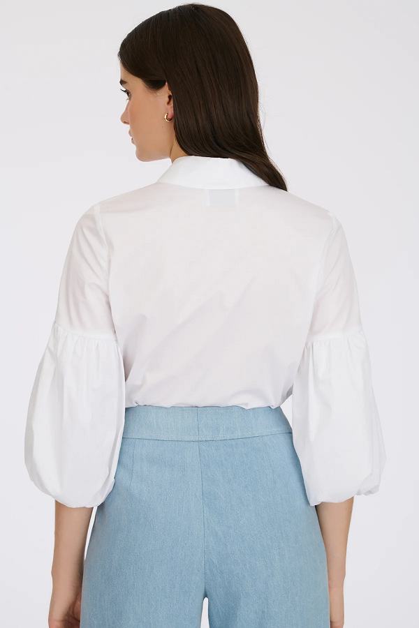 Однотонна смугаста сорочка з рукавами-буфами. Модель виконана з бавовняного попліну. Комір застібається на коштовний ґудзик Weill. Блуза має рукав-ліхтар довжиною 3/4 та потайну застібку на ґудзики.