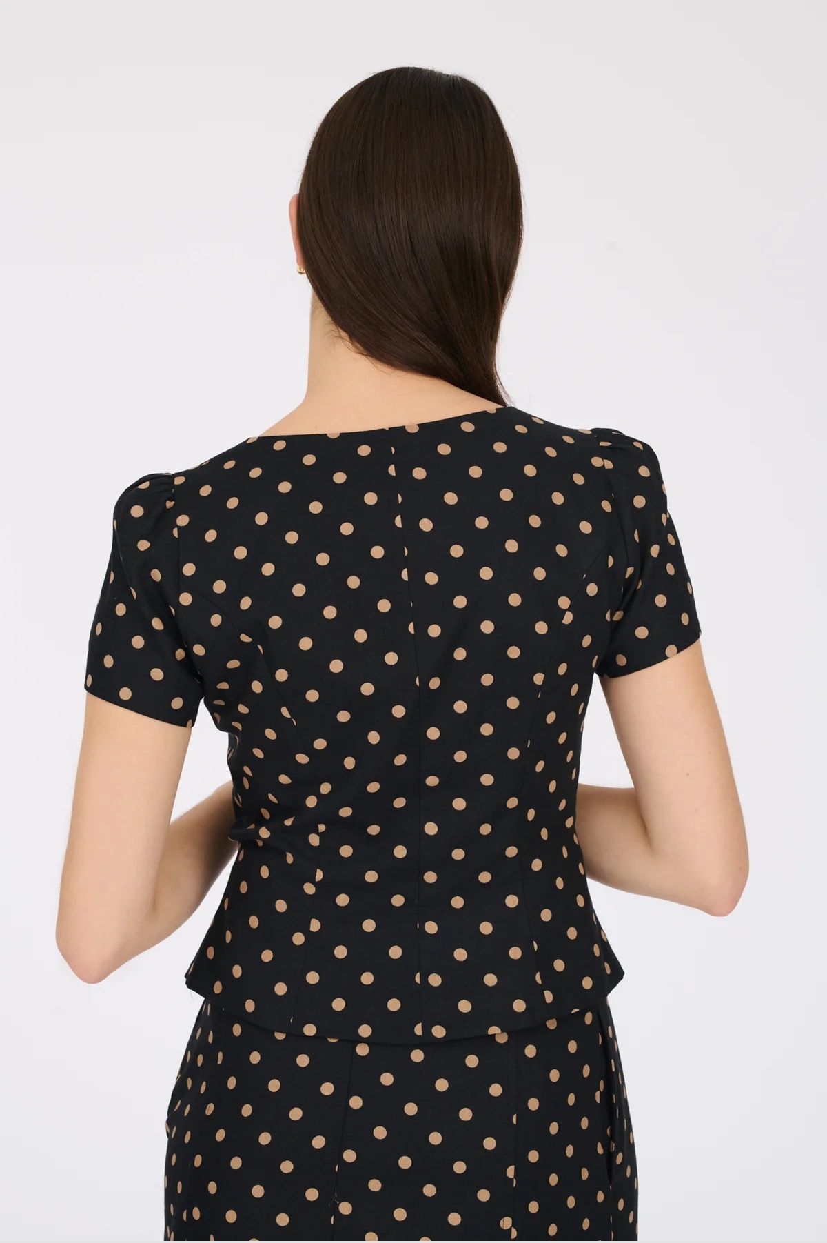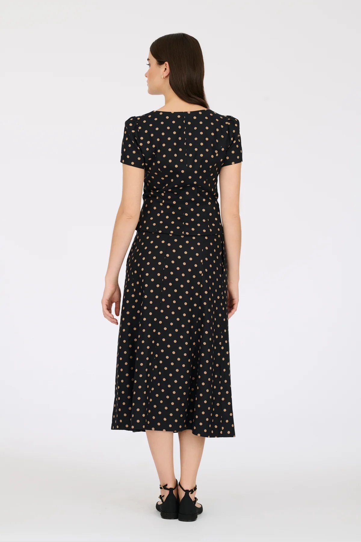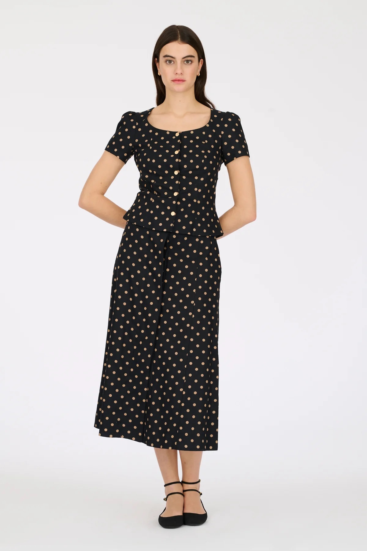 Костюм складається з блузи та спідниці. Лляна блуза в горошок на ґудзиках. Має квадратний виріз горловини, короткий рукав та приталений крій. Довга спідниця в горошок з льону, з поясом, що зав'язується на талії. Має струмливий крій, знімний пояс, що зав'язується на талії, дві бокові врізні кишені та застібку на ґудзики під клапаном.