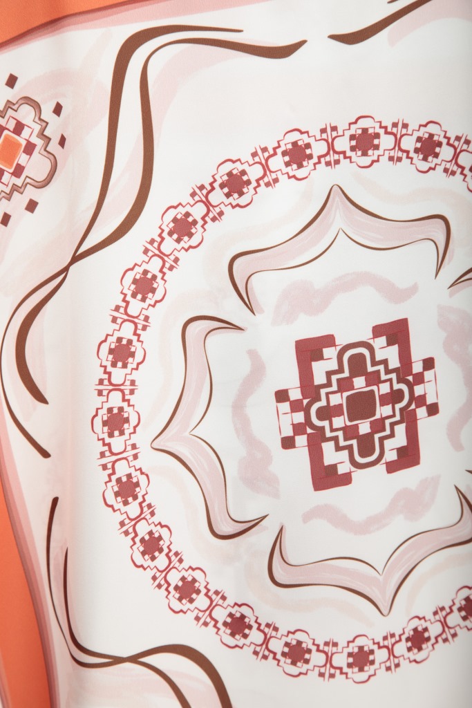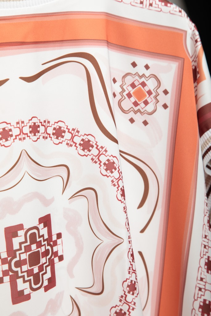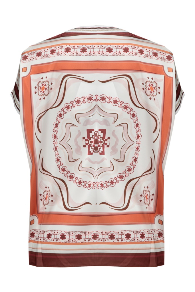 Дизайн блузи вирізняється принтом у стилі барокових орнаментів, які додають образу вишуканості. Блуза виконана у вільному силуеті, має округлий виріз та короткі рукави.