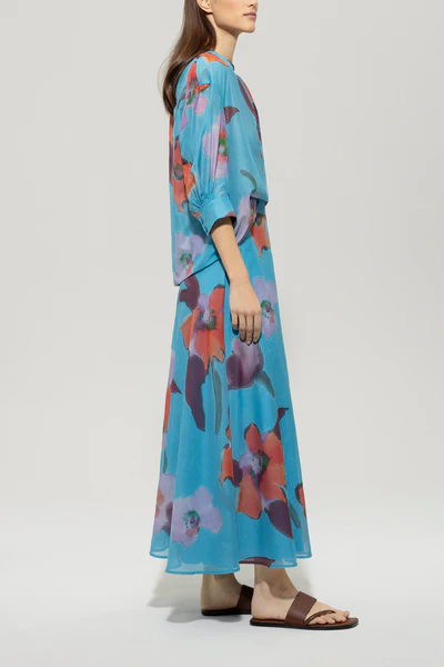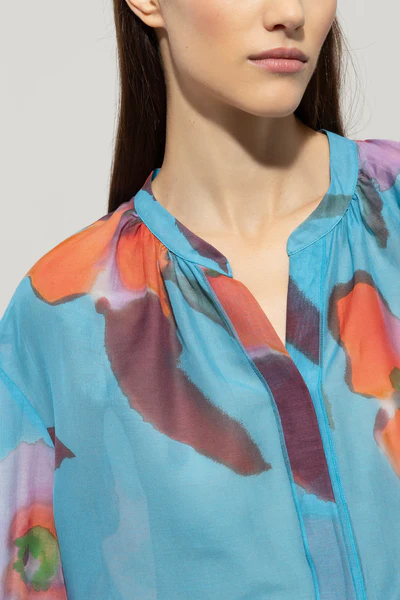 Повсякденна блуза-туніка з ніжної, напівпрозорої бавовняно-шовкової вуалі з ексклюзивним принтом у вигляді квіток гібіскуса. Крій передбачає глибокий виріз горловини з оздобленням, втачний рукав з манжетами на двох ґудзиках і ледь помітними деталями зі зборами.