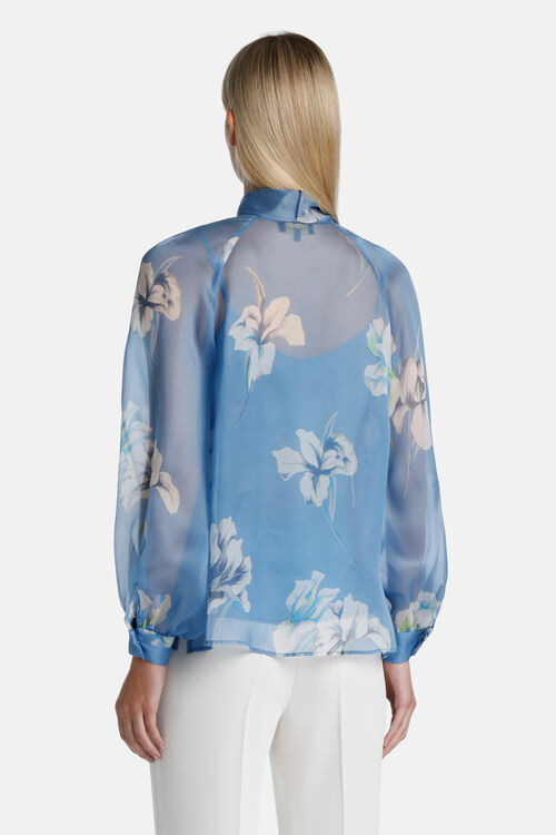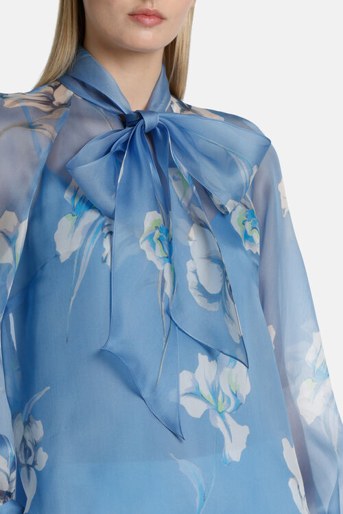 Елегантна квіткова блуза з шовку. Комір оздоблений поясом, що зав'язується на шиї, рукави пишні з манжетами, з підкладкою з регульованими бретелями.