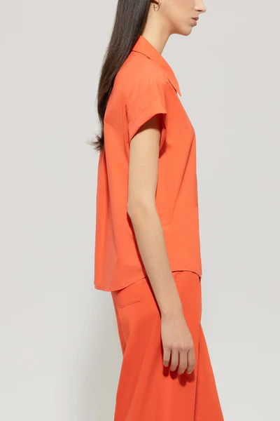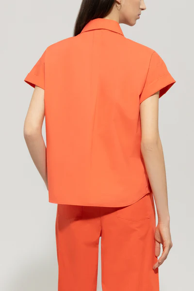 Блуза-сорочка з чистої бавовни з потайною застібкою на ґудзики, боковими розрізами і тонкою зав'язкою на комірі. Короткі рукави мають підвернутий край.