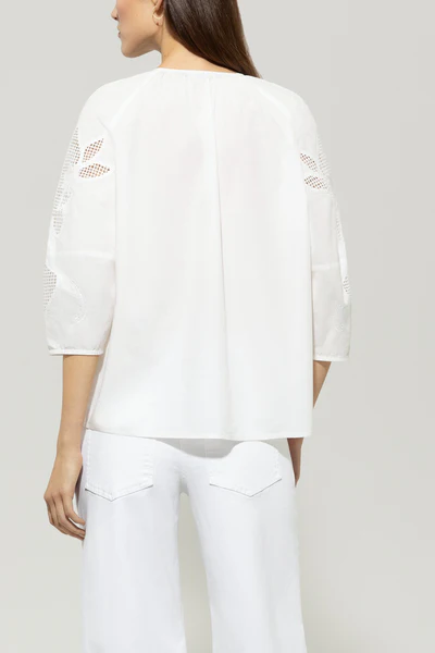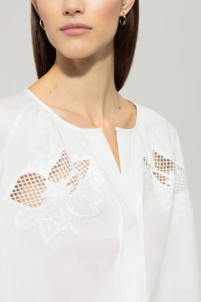 Блуза з легкого бавовняного попліну зі складною вишивкою та рукавом 3/4. V-подібний виріз спереду та двошарове полотнище завершують образ туніки.