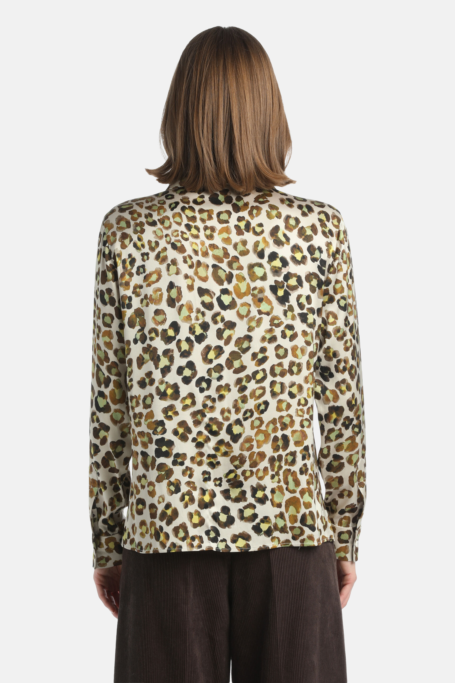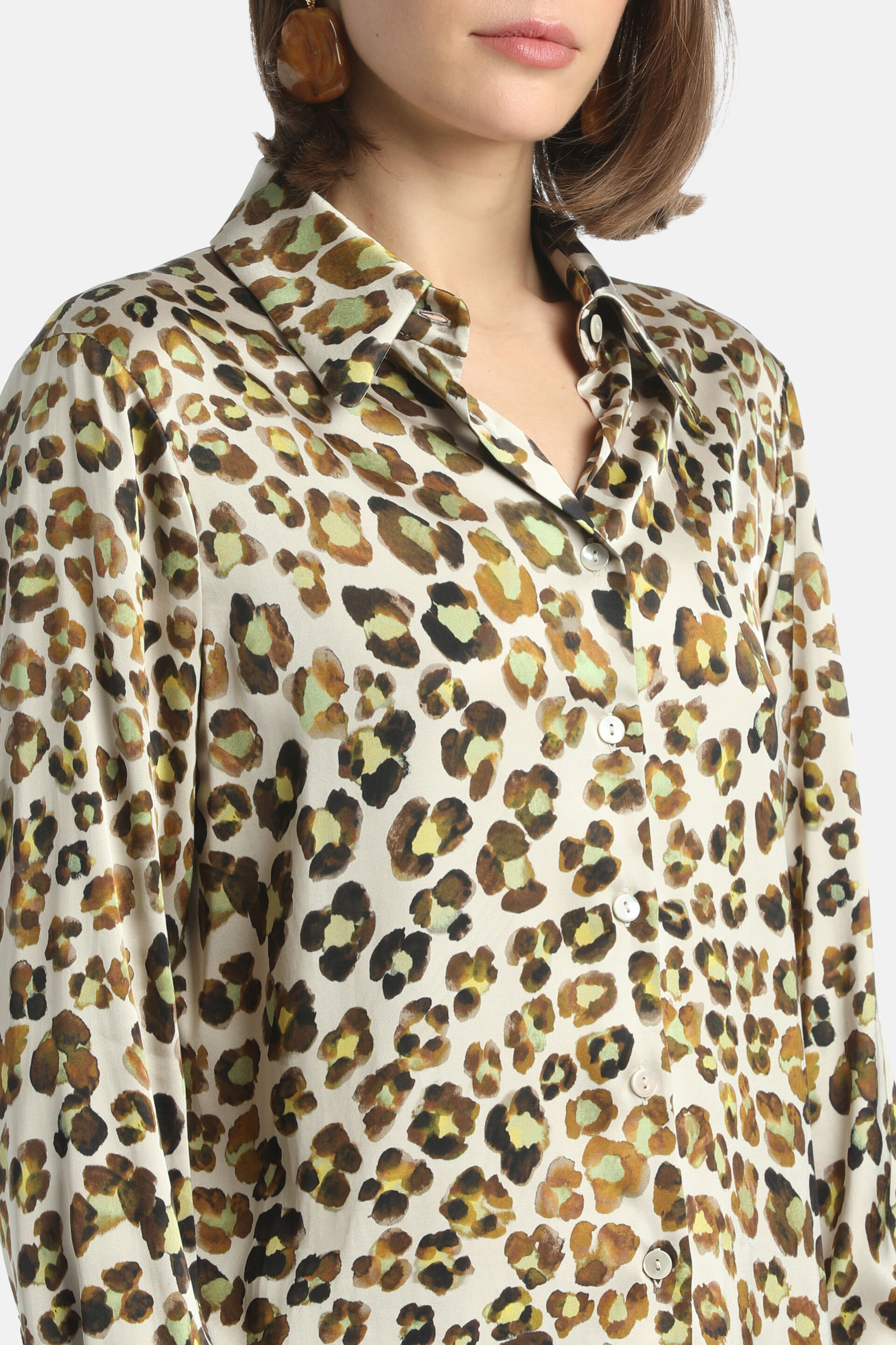 Шовкова блуза з леопардовим принтом, класичним коміром, однотонними ґудзиками та прямим низом. Класичний крій.