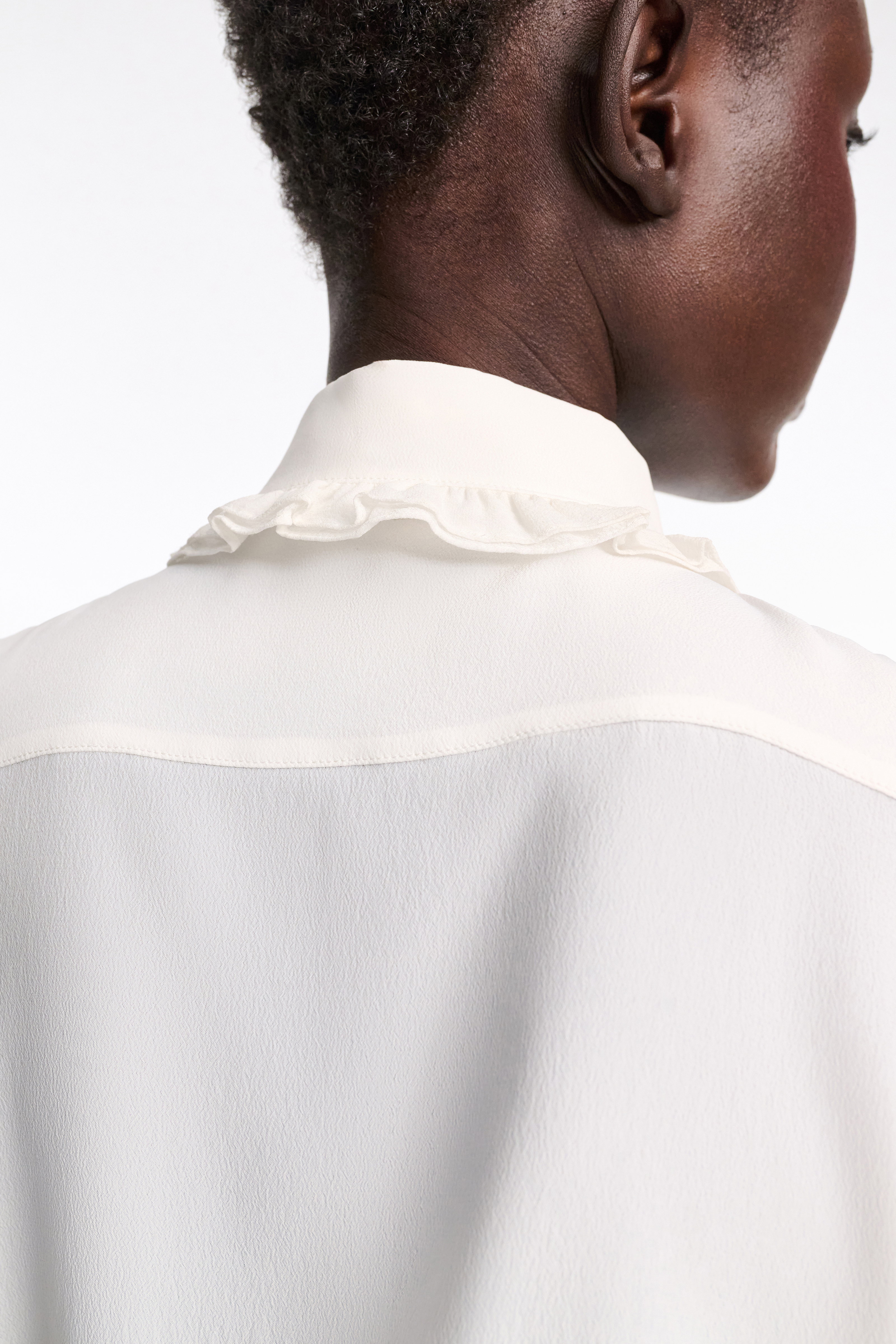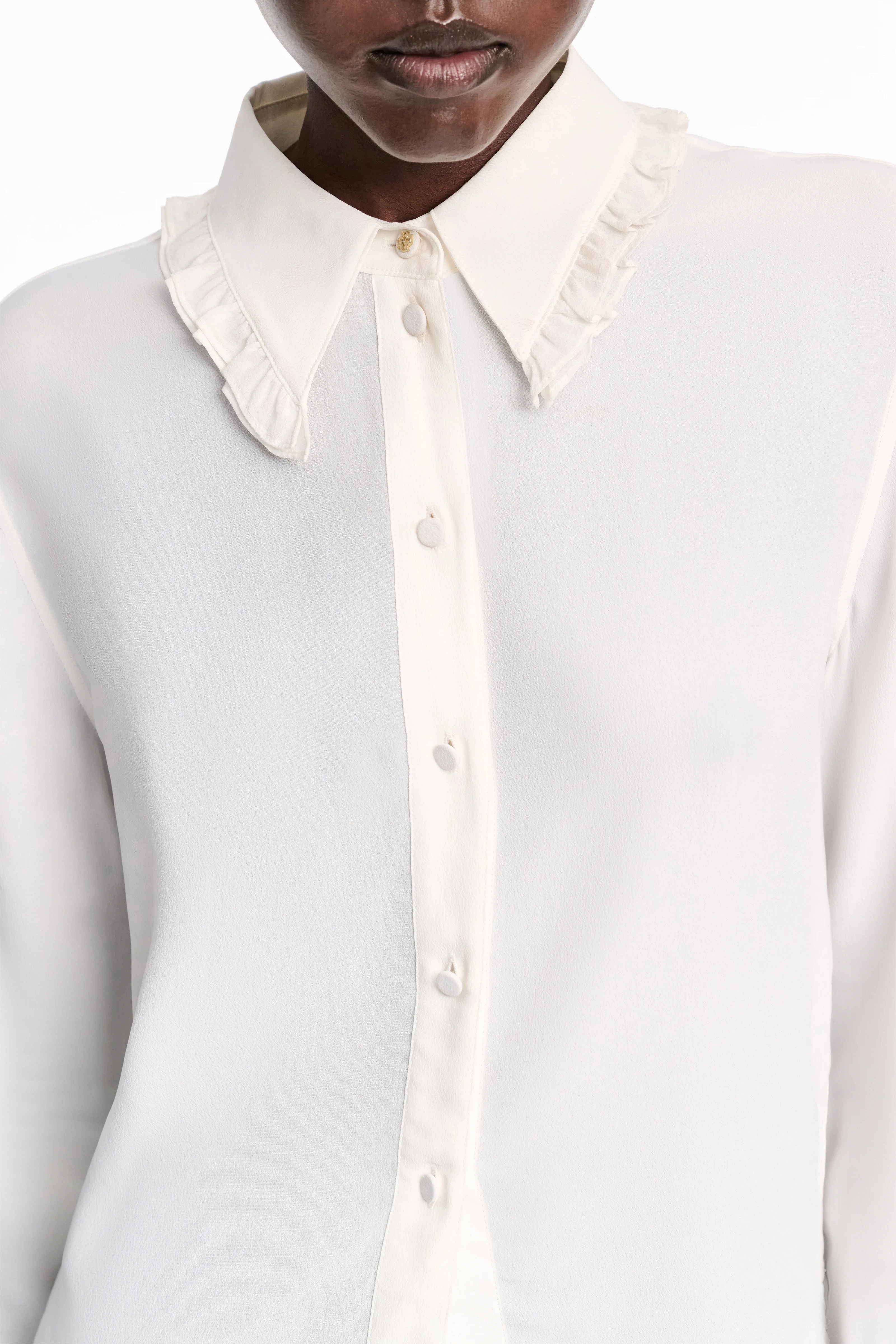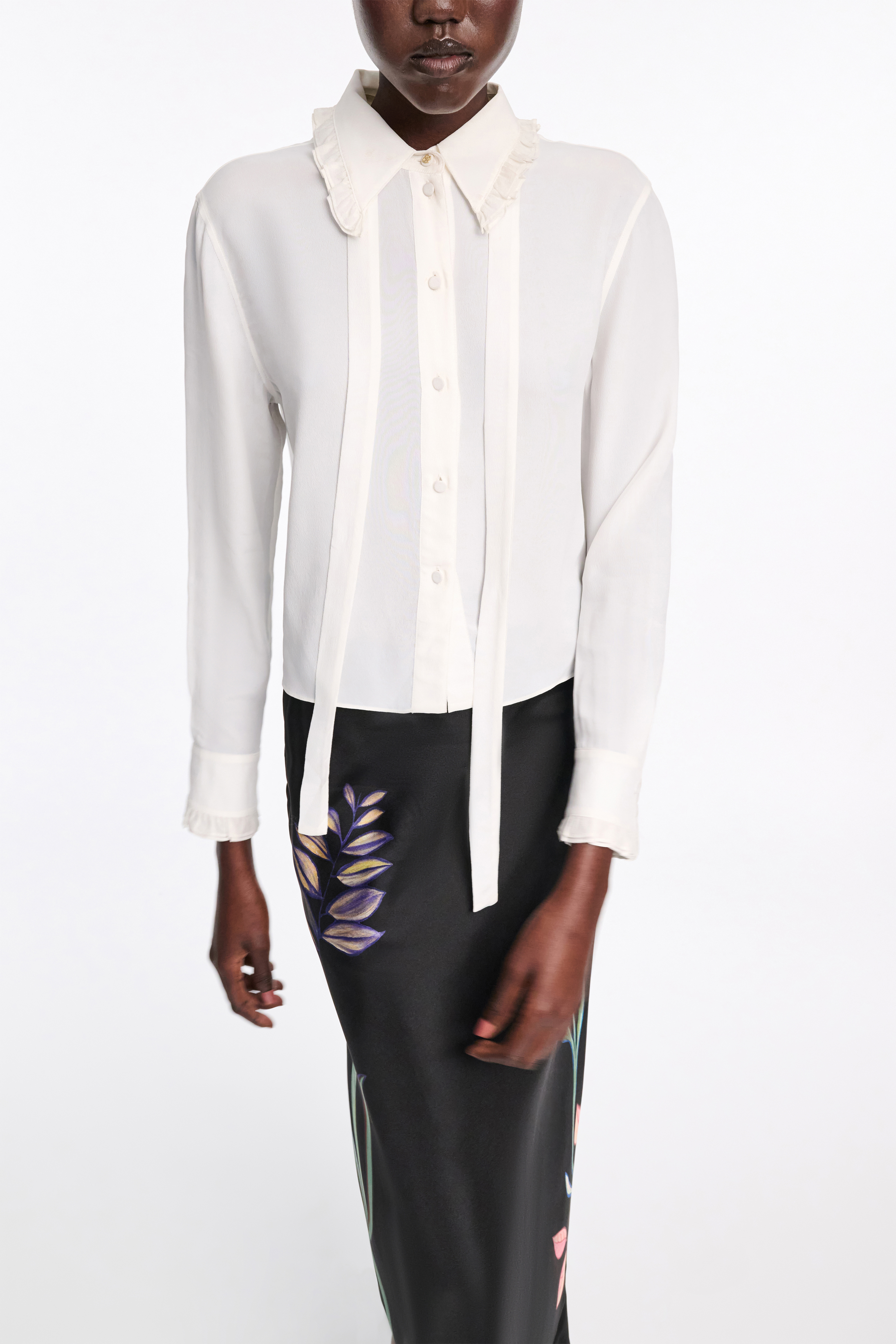 Блуза виконана з струмливого шовково-віскозного крепу де Шин і має ніжну рюшівку на комірі та манжетах. Блуза має знімний комір-краватку з кнопками D-rose.