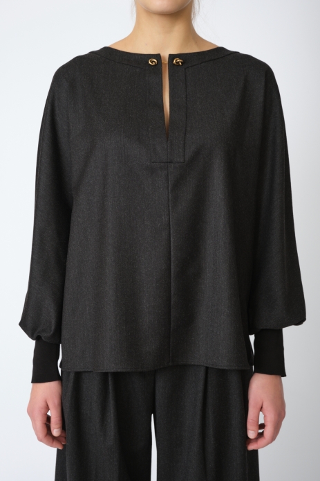 Вишукана блуза з м’якої теплої тканини, виконана у мінімалістичному стилі. Модель має вільний силует, довгий рукав і акуратний V-подібний виріз, прикрашений стильними декоративними ґудзиками.