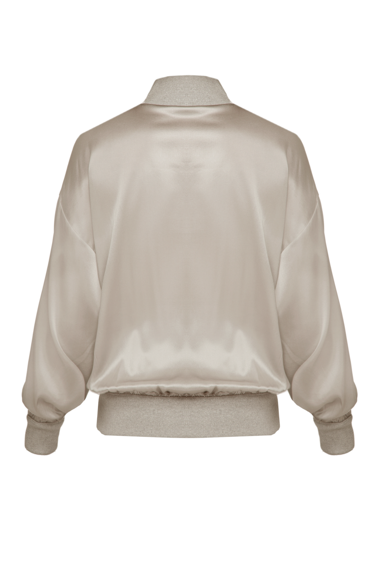 Елегантна блуза з шовку та еластану з м’яким блиском і ніжною фактурою. Модель із високим коміром та легким драпуванням, що красиво підкреслює силует. Завдяки еластичній вставці понизу блуза має бездоганну посадку й легко поєднується як з класичними брюками, так і зі спідницями.