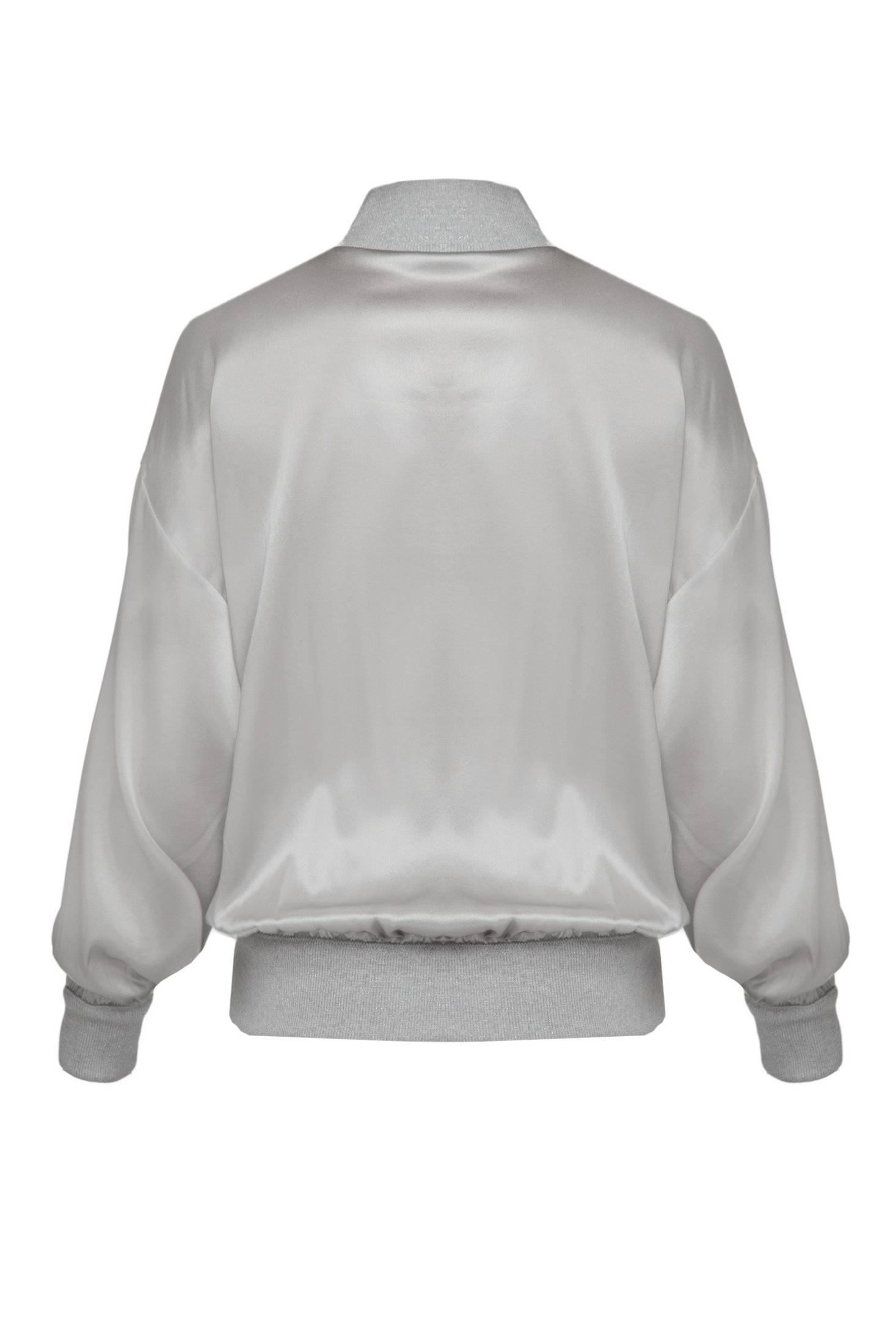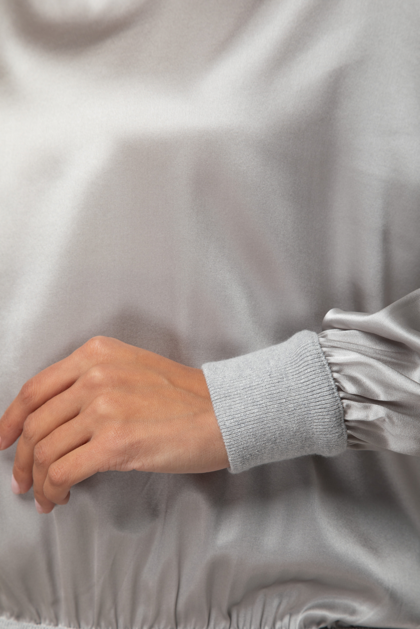 Елегантна блуза з шовку та еластану з м’яким блиском і ніжною фактурою. Модель із високим коміром та легким драпуванням, що красиво підкреслює силует. Завдяки еластичній вставці понизу блуза має бездоганну посадку й легко поєднується як з класичними брюками, так і зі спідницями.