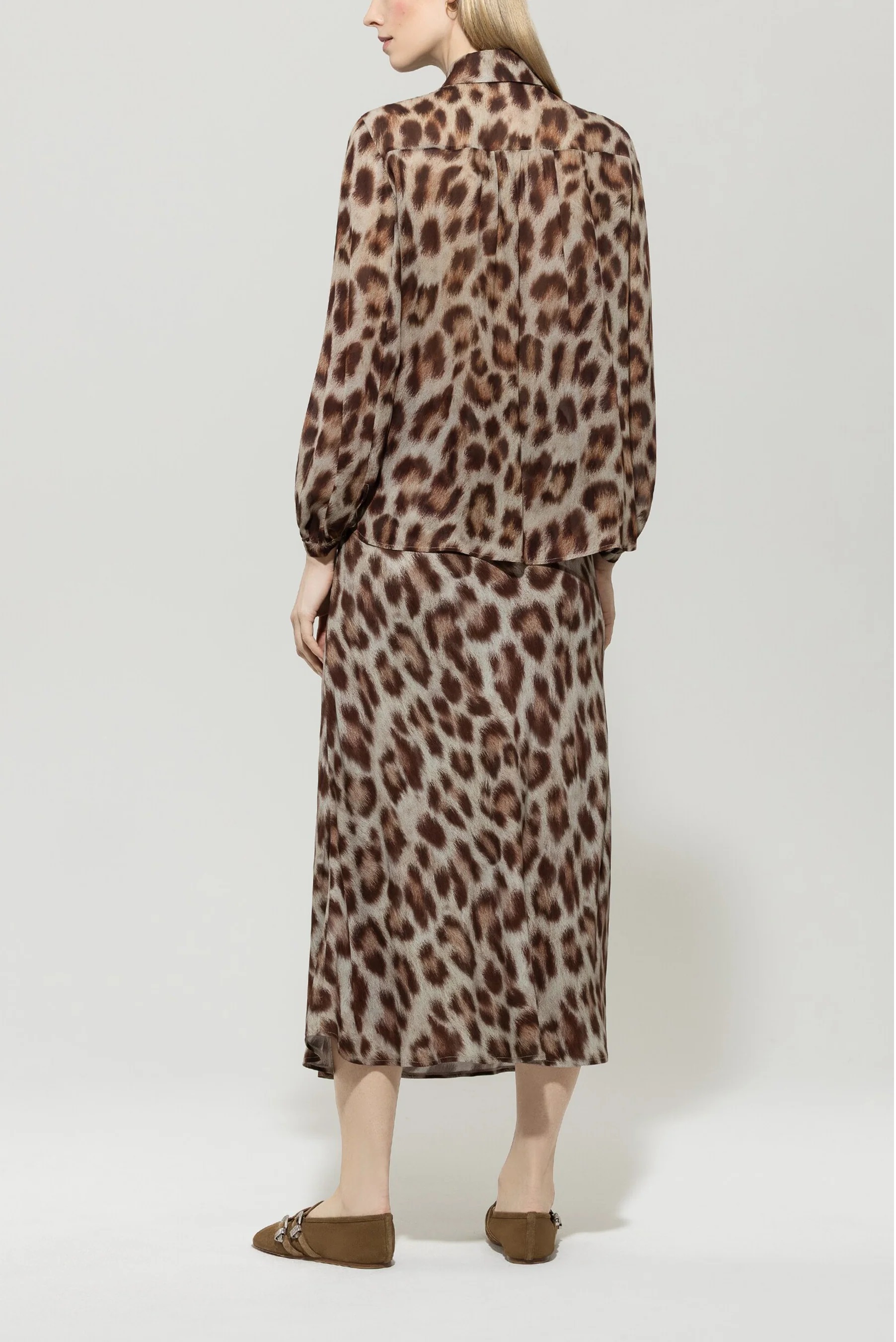 Блуза-сорочка з напівпрозорого віскозного крепдешину з ексклюзивно розробленим анімалістичним дизайном і злегка пишними рукавами. Застібка на ґудзиках по всій довжині також має зав'язки. Заокруглений поділ з розрізом збоку.