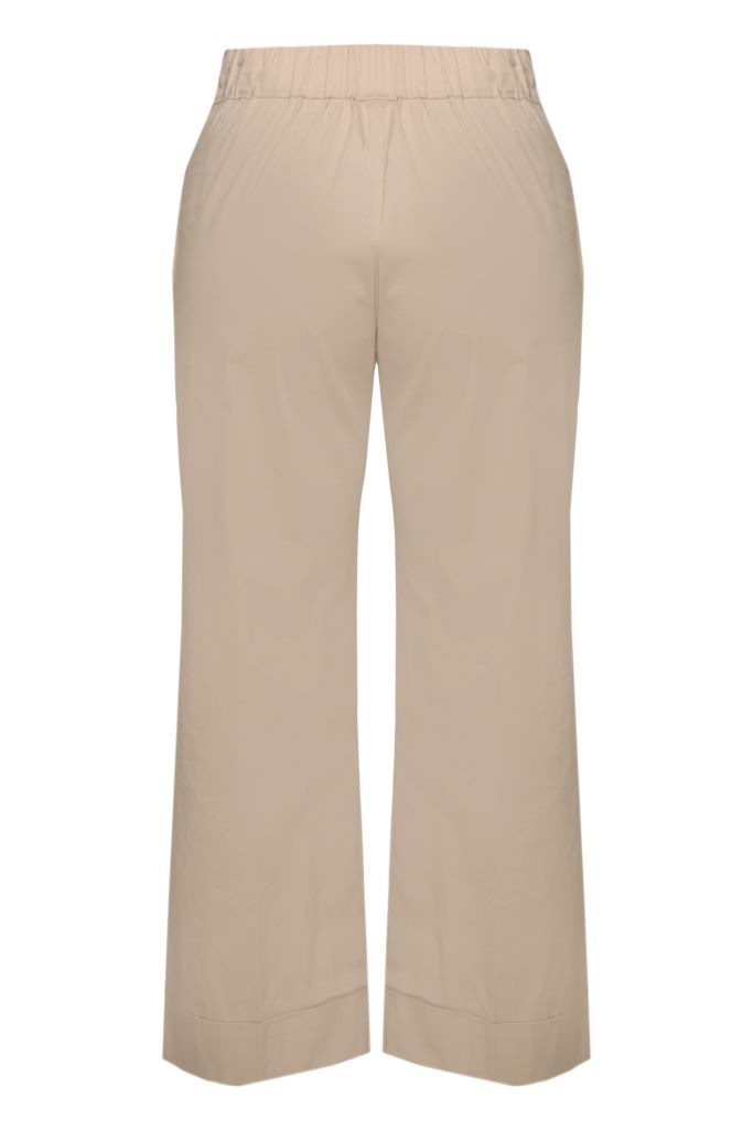 Брюки з бавовни мають класичний крій та пояс на резинці. Широкі прямі штанини додають елегантності та комфорту цій моделі. Відсутність видимих застібок і декоративних елементів робить їх універсальним варіантом для створення стильних образів як у діловому, так і в повсякденному житті.