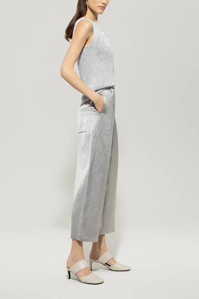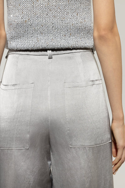 Брюки довжиною ¾ з широкими прямими штанинами. Виготовлені з щільного атласу, мають бокові прорізні кишені та накладні кишені ззаду розміру XXL.