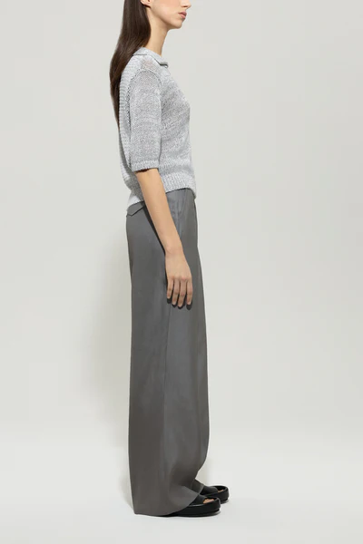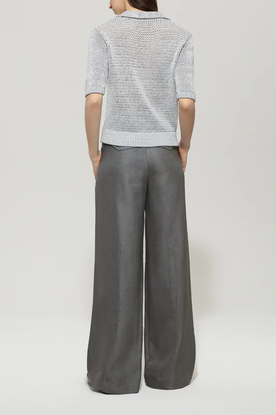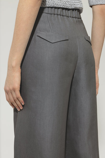 Повсякденні широкі штани з лляного габардину з елегантним блиском. Модель зі складками та частковим еластичним поясом, а також двома боковими кишенями та двома врізними задніми кишенями з клапанами.