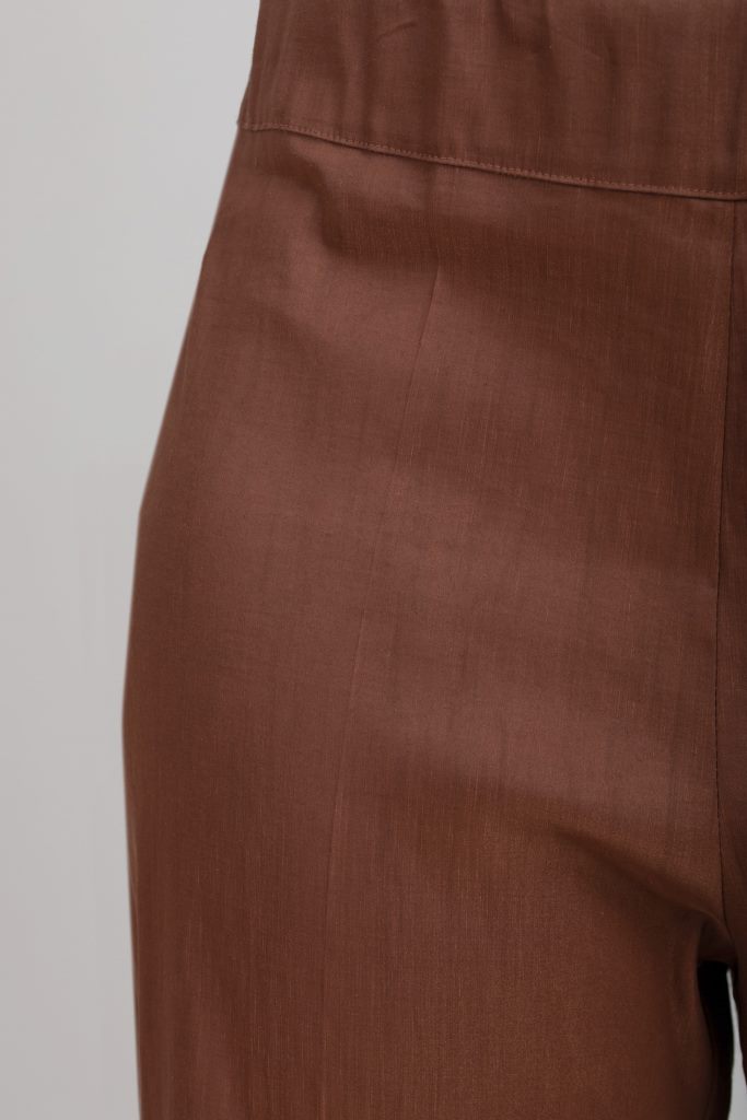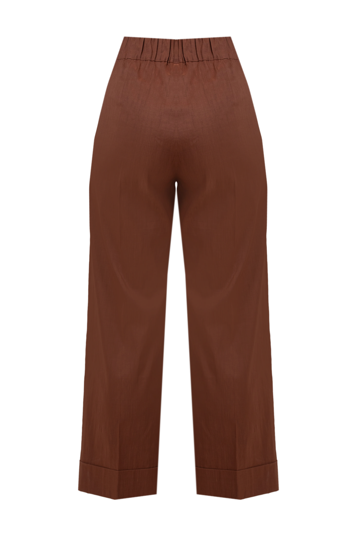 Брюки мають елегантний, прямий крій із широкими штанинами. Декоративна горизонтальна стрічка на поясі додає вишуканості та унікальності дизайну. Низ штанин оформлений широкими манжетами, що додає структурованості силуету.