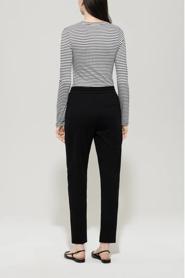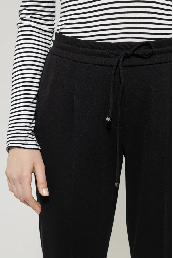 Облягаючі брюки зі струмливої тканини Punto Milano зі складками, двома прорізними кишенями та фальшивою кишенею ззаду. Зручний еластичний пояс на резинці зі шнурком.