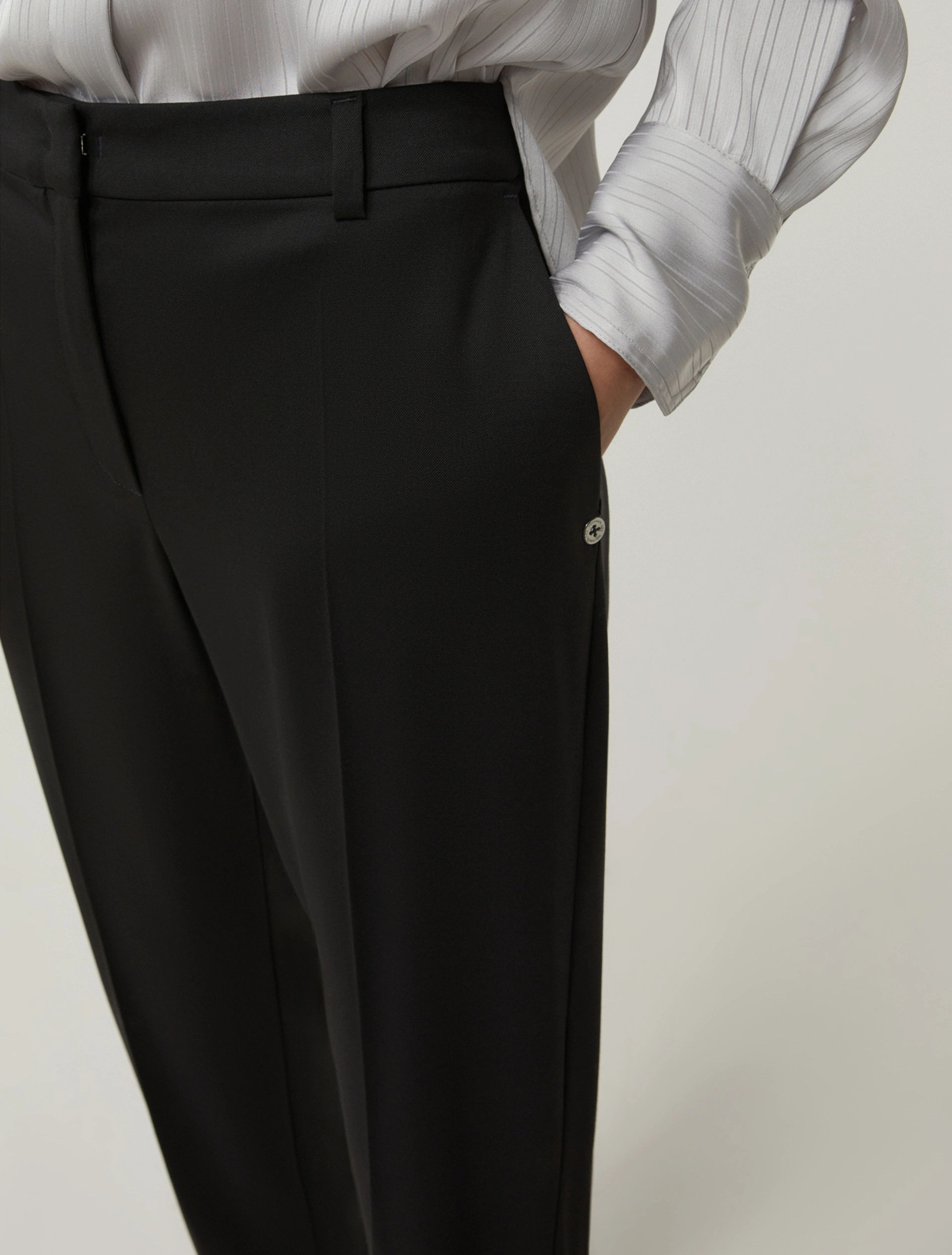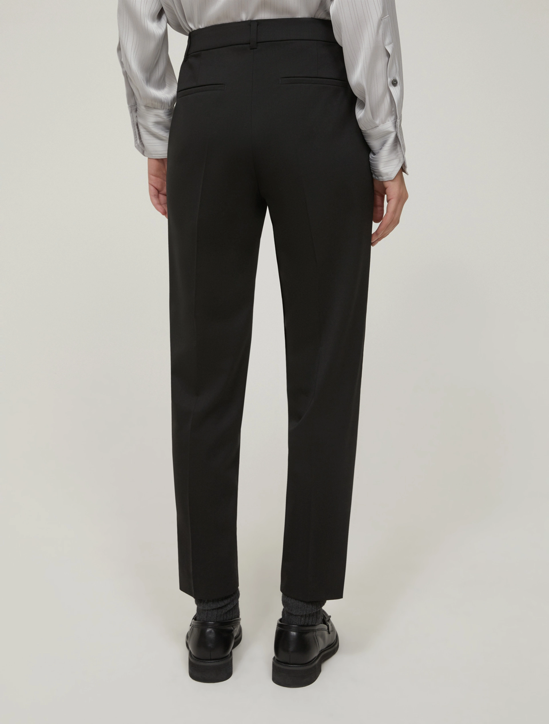 Ці брюки з вовняної саржі стануть незамінним елементом вашого зимового гардеробу: ваш образ буде ідеальним, незалежно від того, з чим ви їх поєднаєте. Модель має середню посадку з петлями для ременя, прессовані складки, косі передні кишені та задні кишені з виточками. Модель довжиною до щиколотки.