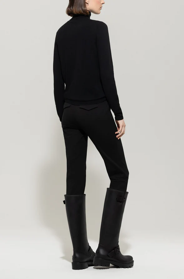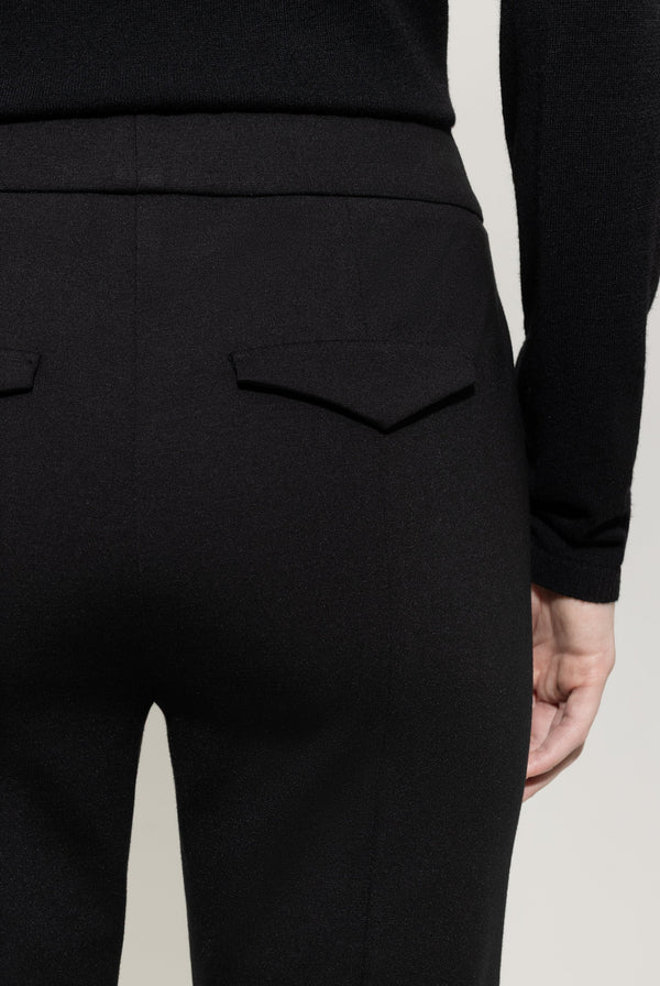 Брюки slim-fit елегантного дизайну з трохи укороченим кроєм. Штани виготовлені з м'якої тканини punto milano і мають зручний еластичний пояс, окантовку спереду та дві кишені спереду і ззаду.