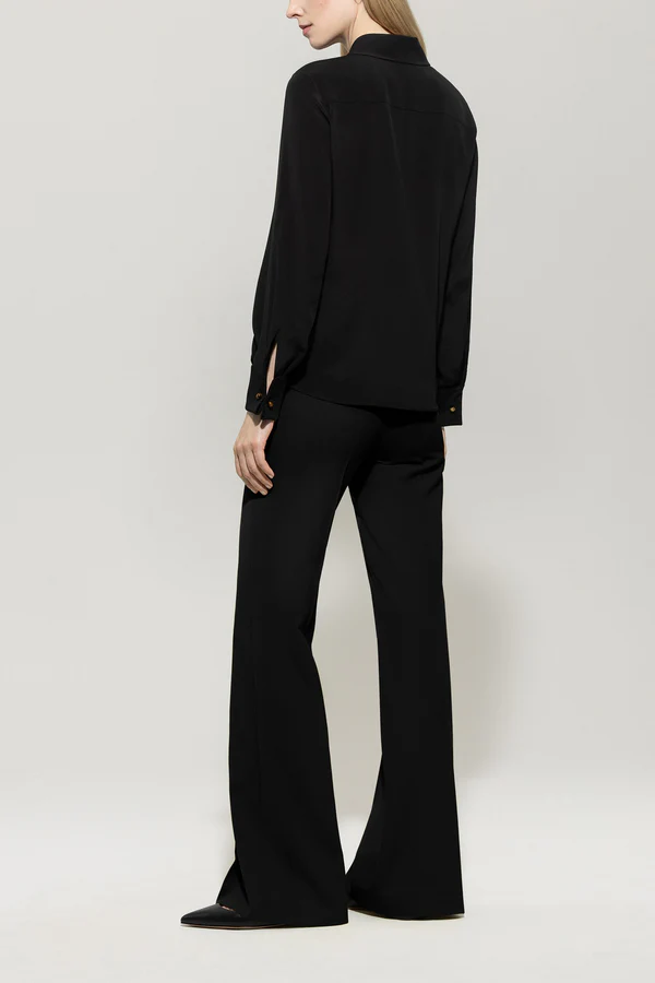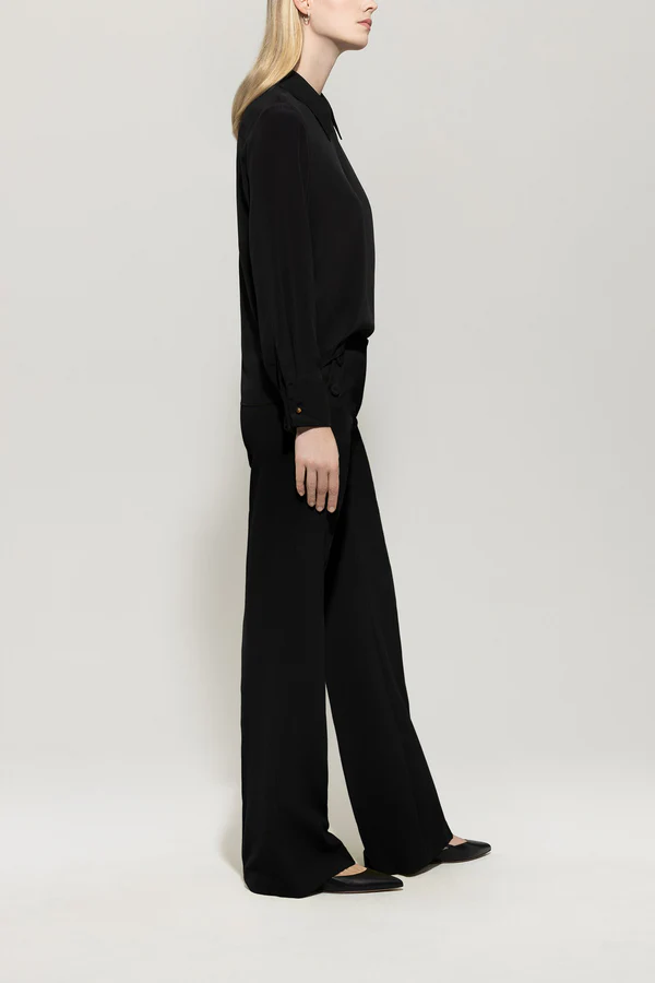 Повсякденні брюки-кльош з м'якої техно-вовни в морському стилі з обтягнутими тканиною ґудзиками. Дві бічні кишені та позначена задня кишеня доповнюють дизайн.
