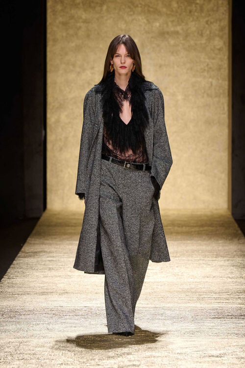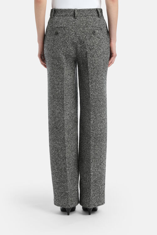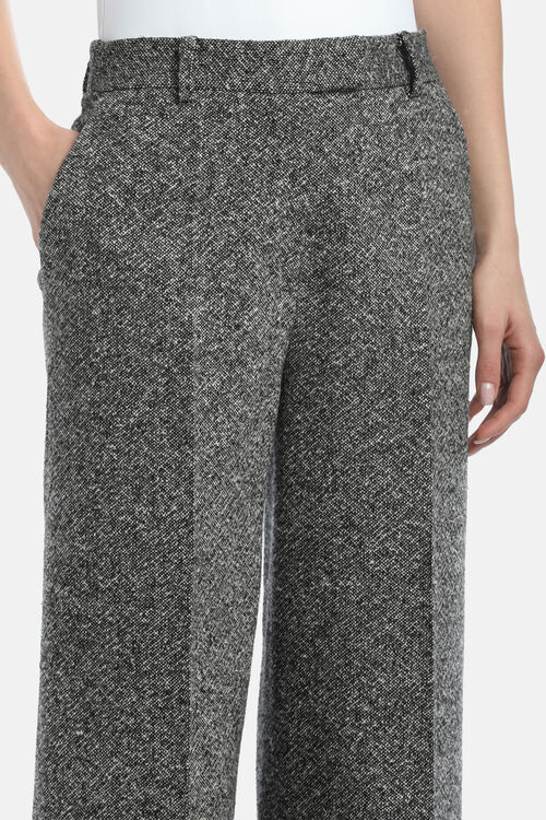 Класичні брюки з меланжевої вовняної суміші. Застібка на блискавку та гачок, бічні кишені, виточки, широкі штанини з пресованою складкою.