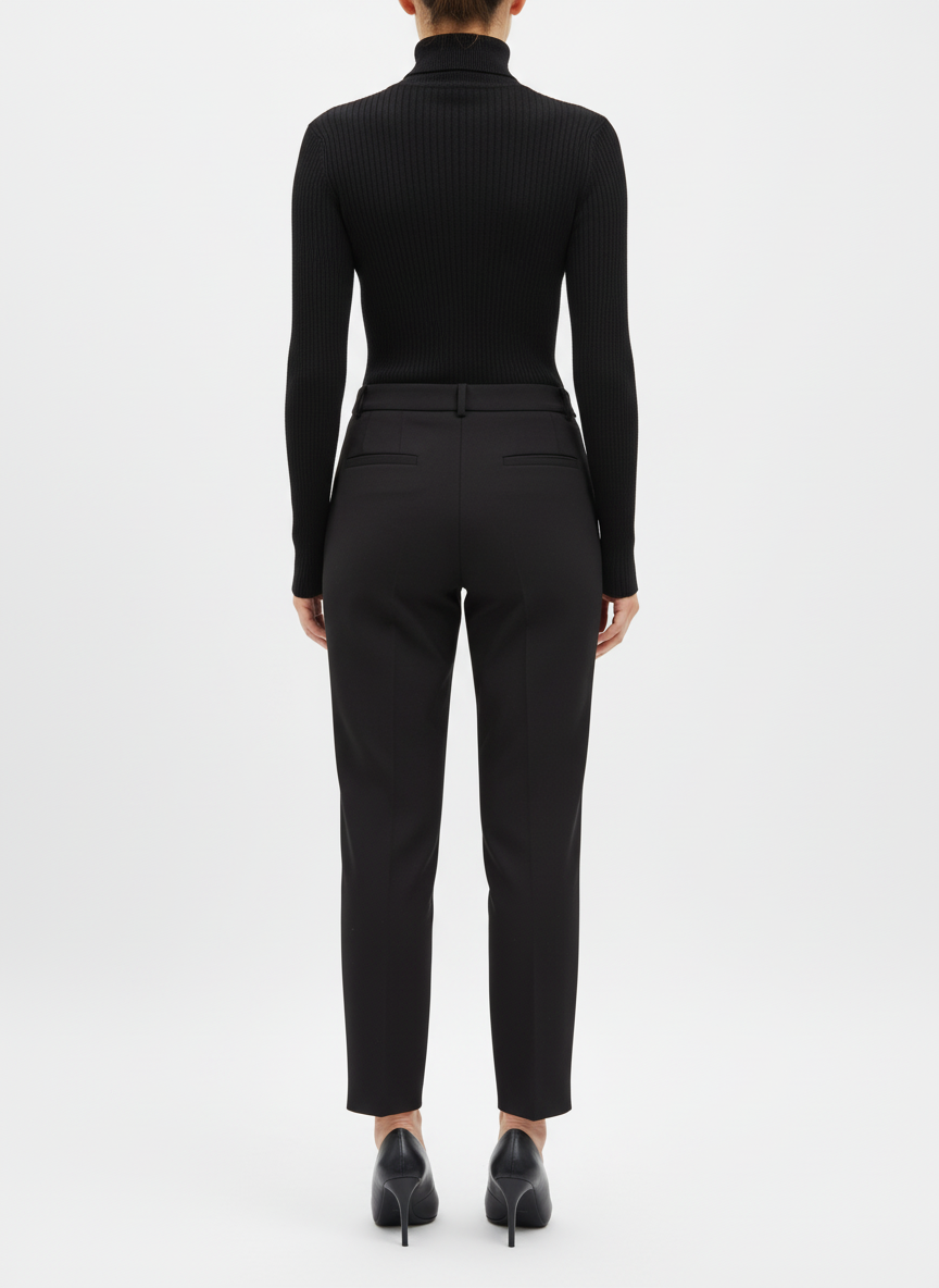 Лаконічний крій цих брюк підкреслює витонченість силуету, а універсальний чорний колір робить їх базовою річчю гардеробу. Вони ідеально поєднуються як з діловими жакетами чи блузами, так і з більш розслабленими светрами для повсякденних образів.