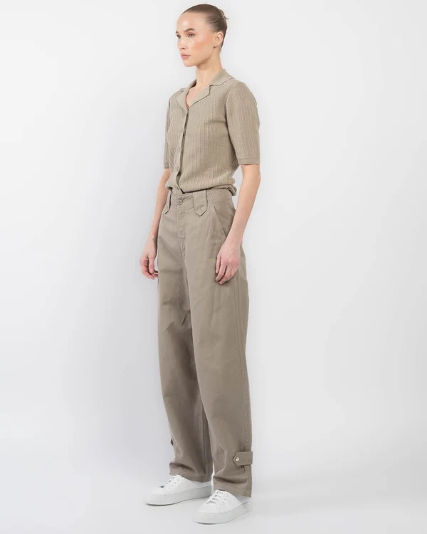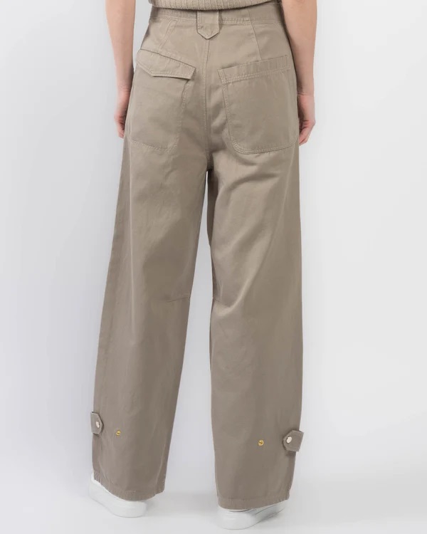 Штани виготовлені з бавовняно-лляної суміші та мають легкий О-подібний силует. Модель повної довжини, на щиколотках - вкладки з ґудзиками, а ззаду - змішані кишені.
