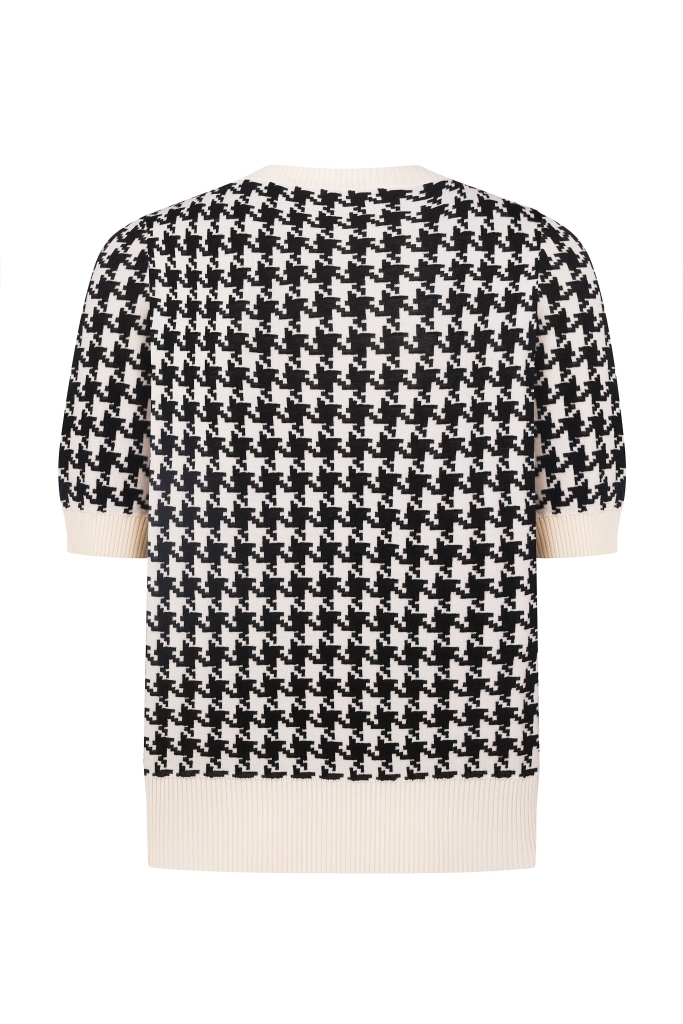 Джемпер з коротким рукавом виготовлений з жакардового матеріалу у ламану клітку. Має круглий виріз. Поділ та манжети в рубчик.