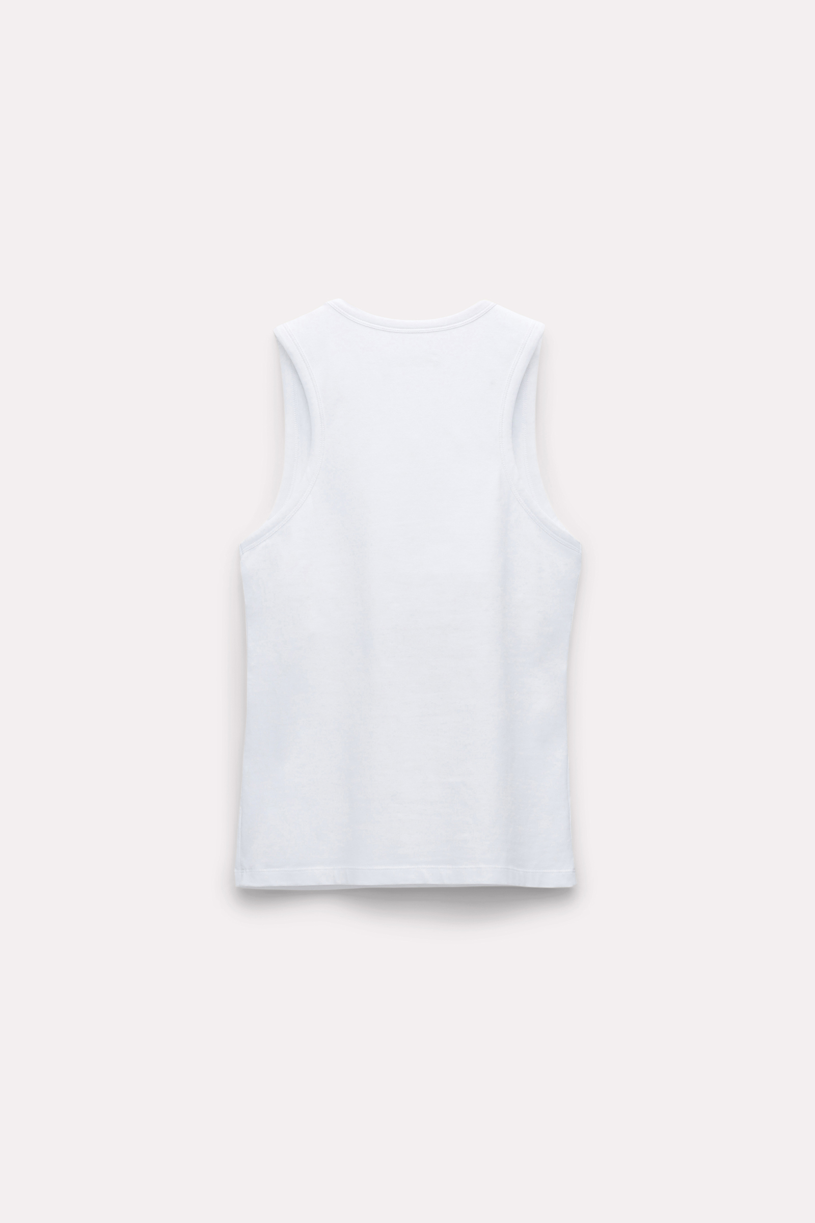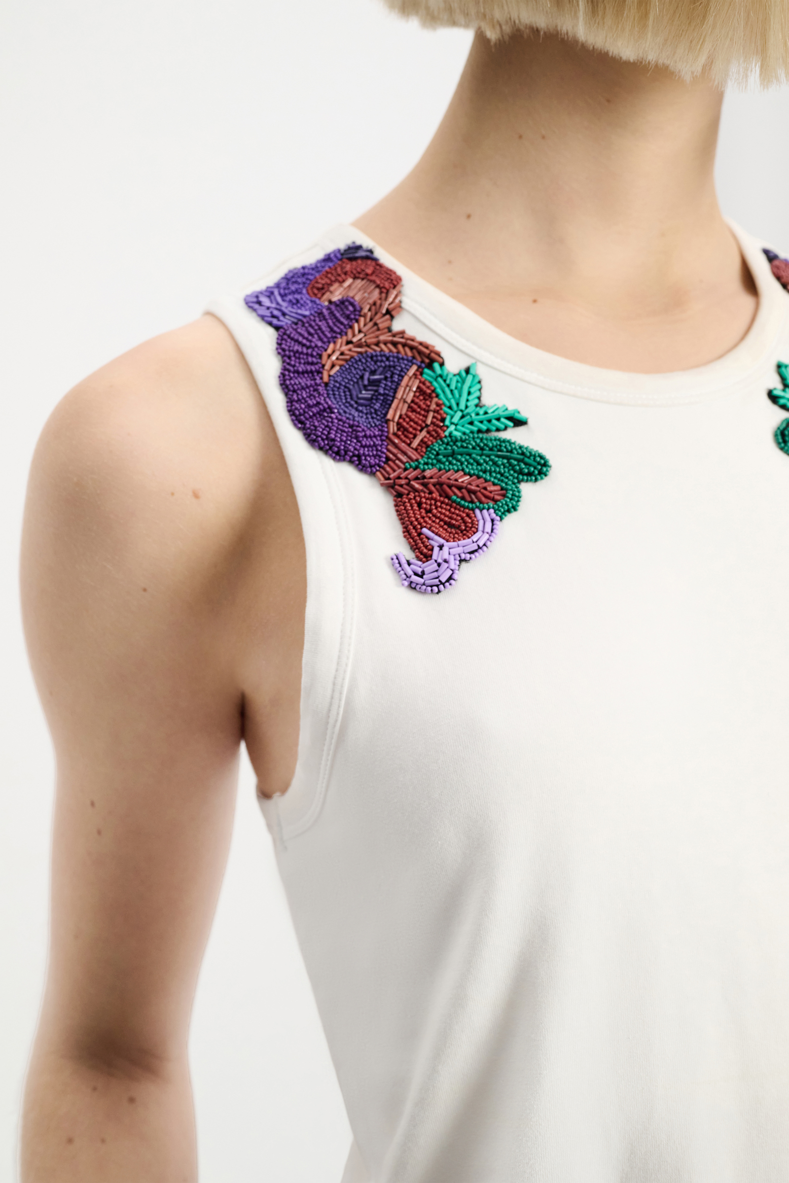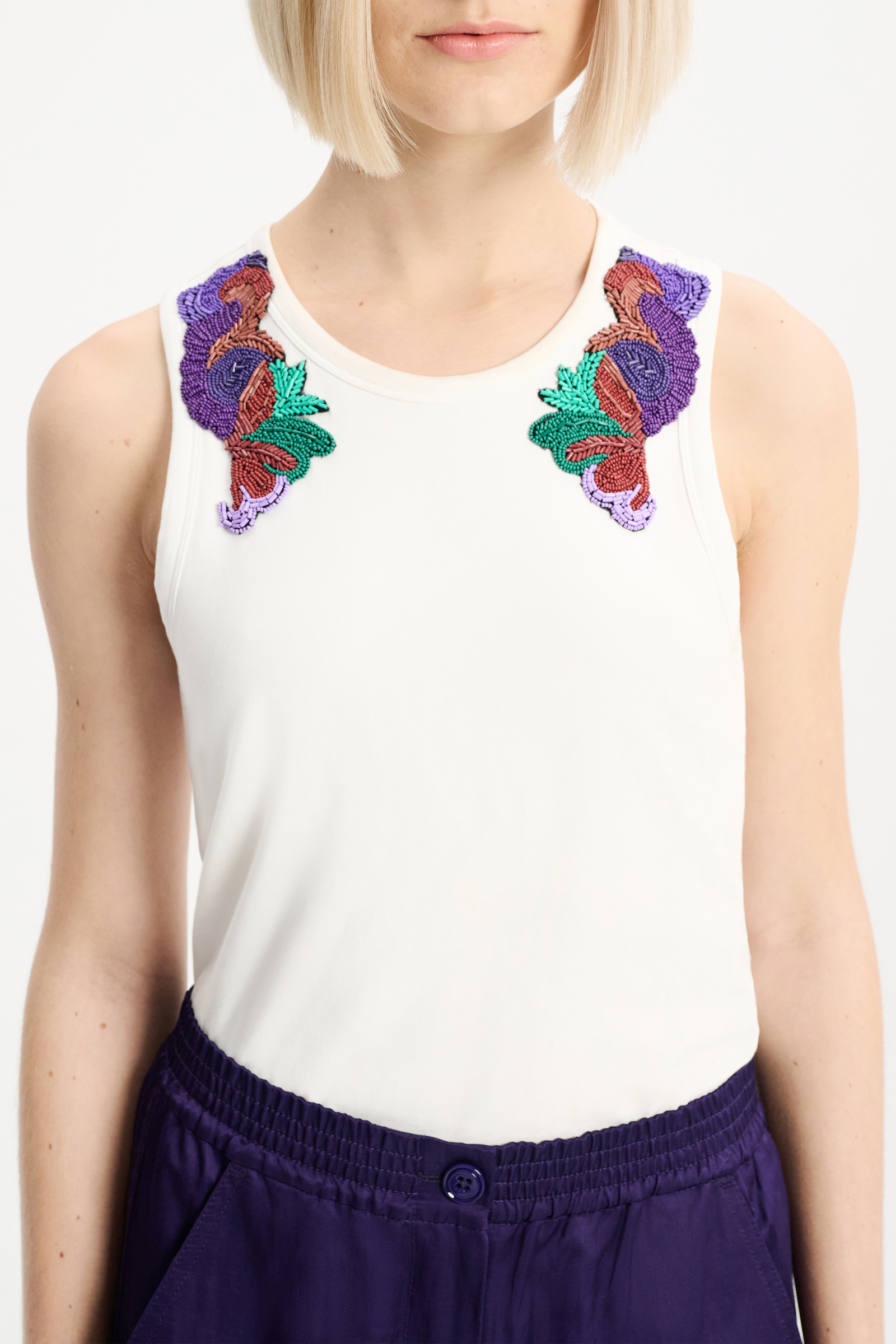 Топ з круглим вирізом горловини виготовлений зі стрейчевої бавовни та має вбудований бюстгальтер. Модель без рукавів прикрашена вишитою аплікацією на плечах.