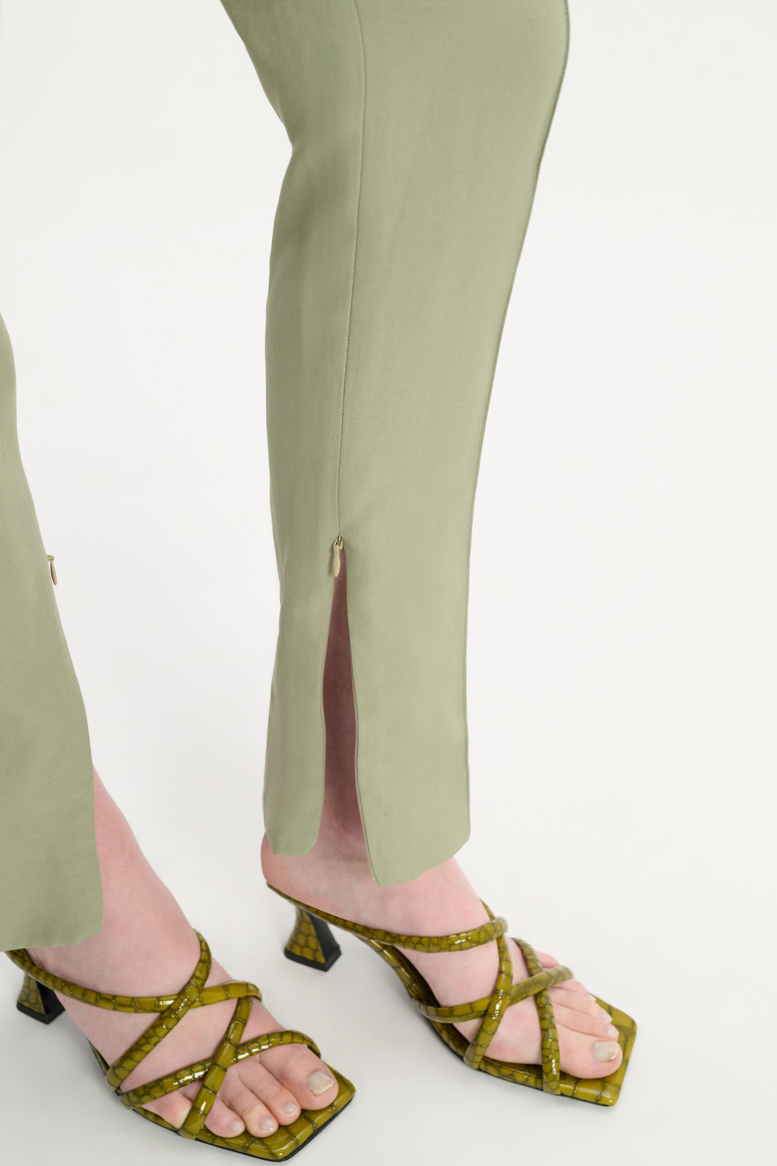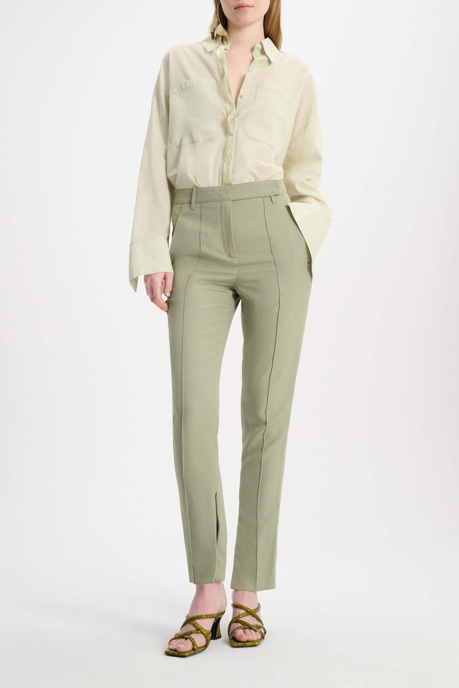 Брюки мають завужений крій і виготовлені з лляної суміші. Повнорозмірний фасон доповнений подовженою застібкою з тасьмою, яка акуратно заправляється під петлю.