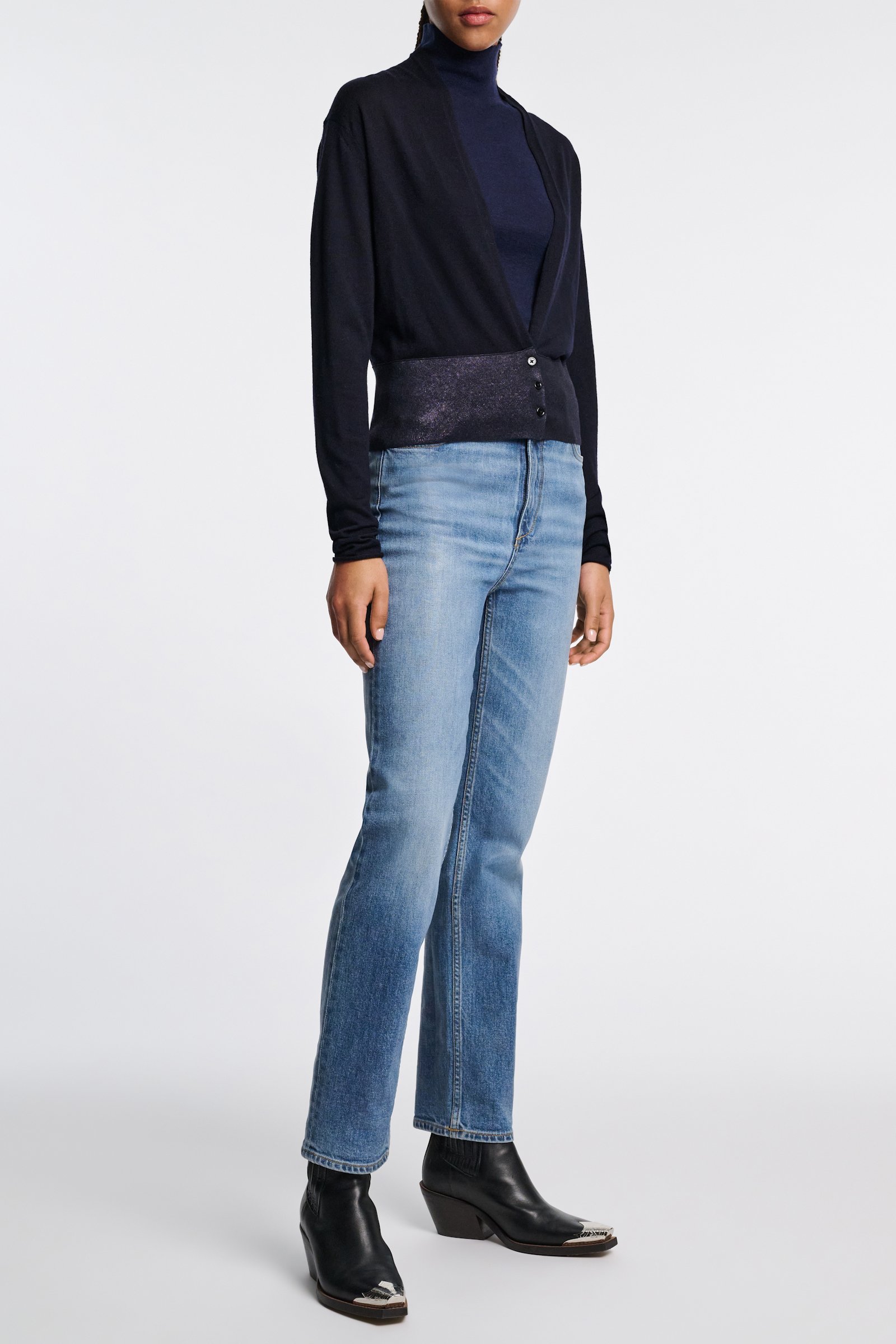 Глибокий V-подібний кардиган зв'язаний з вовни мериноса і прикрашений тональною металевою фольгою на подолі. Силует сучасного крою з перекрученими боковими швами та унікальною драпіровкою на спинці.