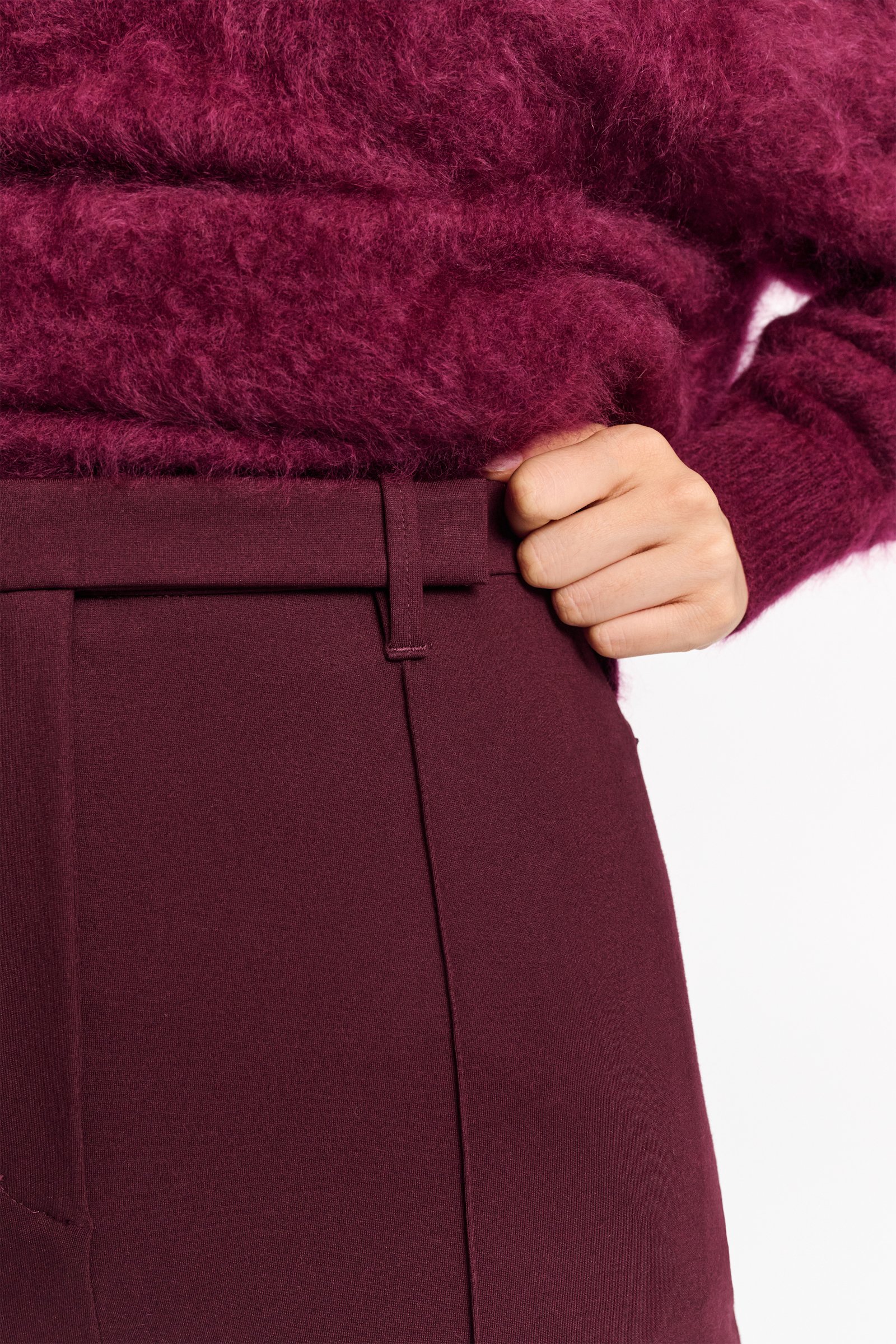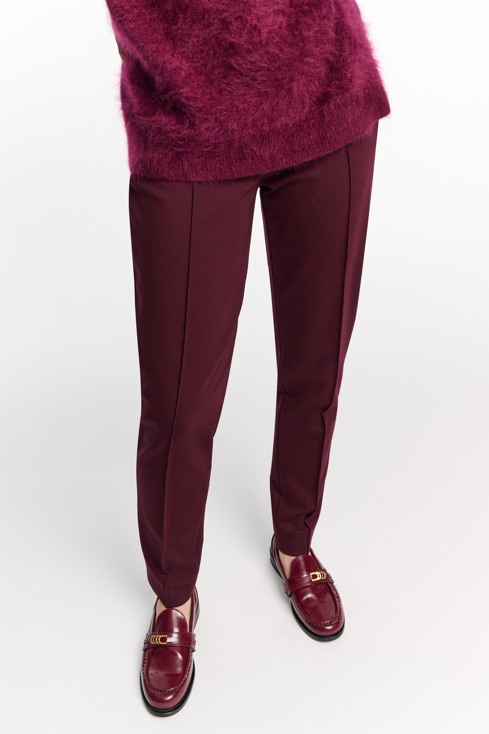 Створені з нашого улюбленого матеріалу Punto Milano, брюки-сигарети облягають фігуру і мають складки попереду. Брюки мають бічні кишені на блискавці та прорізні кишені ззаду. Шукаєте ідеальну пару штанів? Вважайте, що ви їх знайшли.