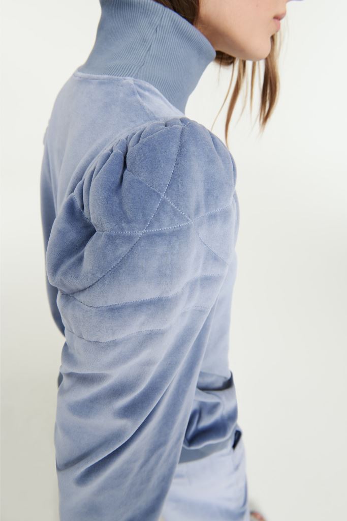 Гольф із оксамитового флісу. Горловина, манжети та поділ в рубчик. Рукави зверху прикрашені легким драпіруванням.