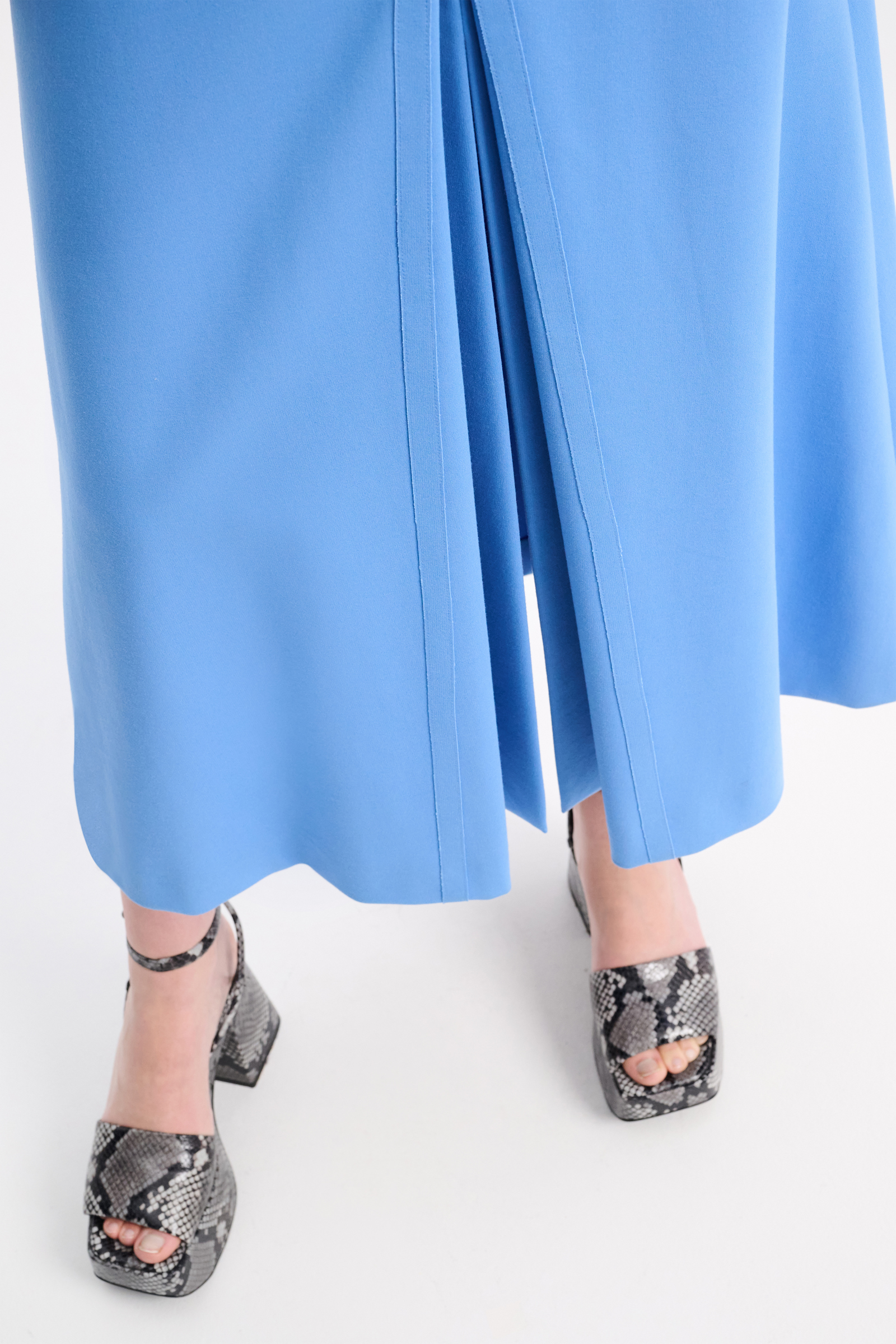 Сукня-футляр виконана з м'якого Punto Milano та оздоблена в тон деталями з еко-шкіри. Розріз спереду регулюється потайною блискавкою.