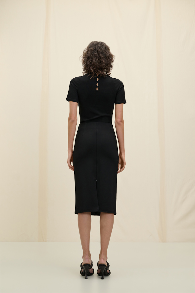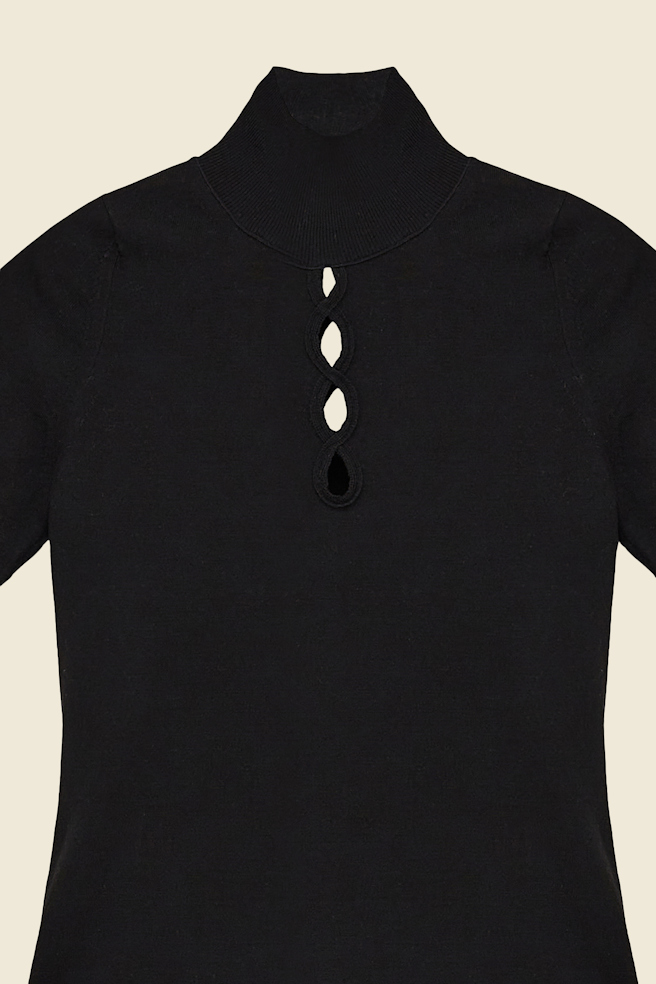 Джемпер з високою горловиною з короткими рукавами має декоративні вирізи, які проходять спереду та ззаду. Дана модель виготовлена з міксу шовку та вовни.