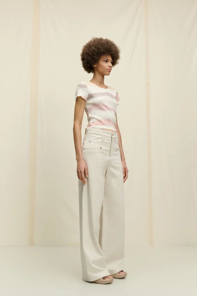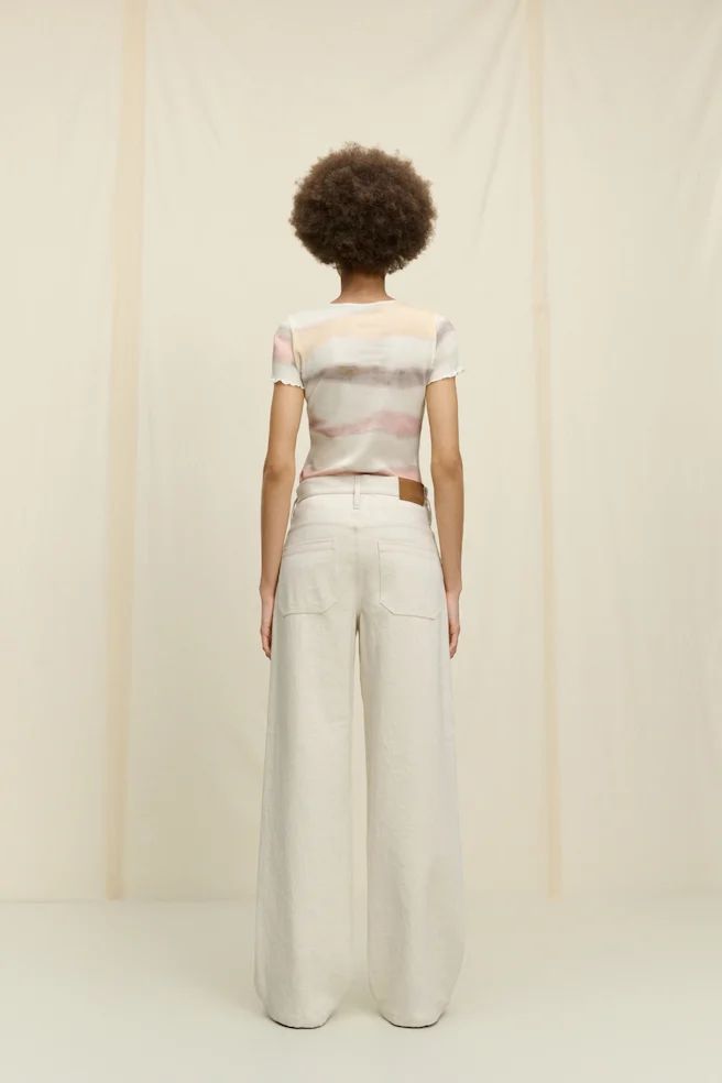 Футболка з хвилями, покрита цифровим принтом, створюючи невимушену пляжну атмосферу.