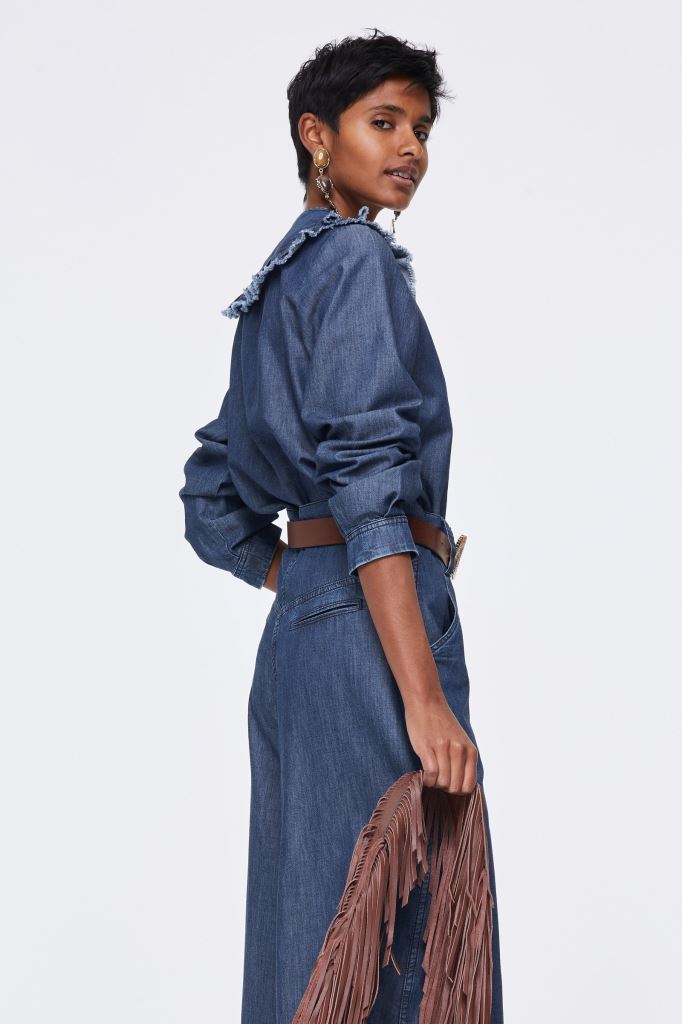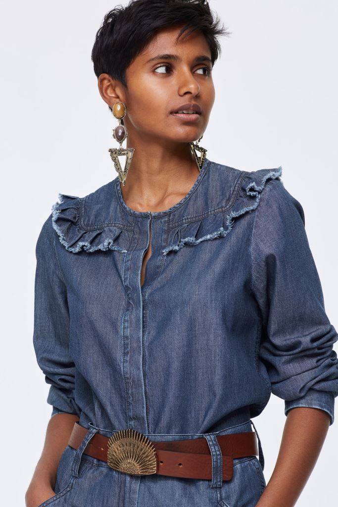 Жіночна блуза з темного деніму. Невеликий комір-стійка з відкритим краєм. Оборки починаються попереду і продовжуються по спинці. Потайна застібка на гудзиках спереду зі шпильками.