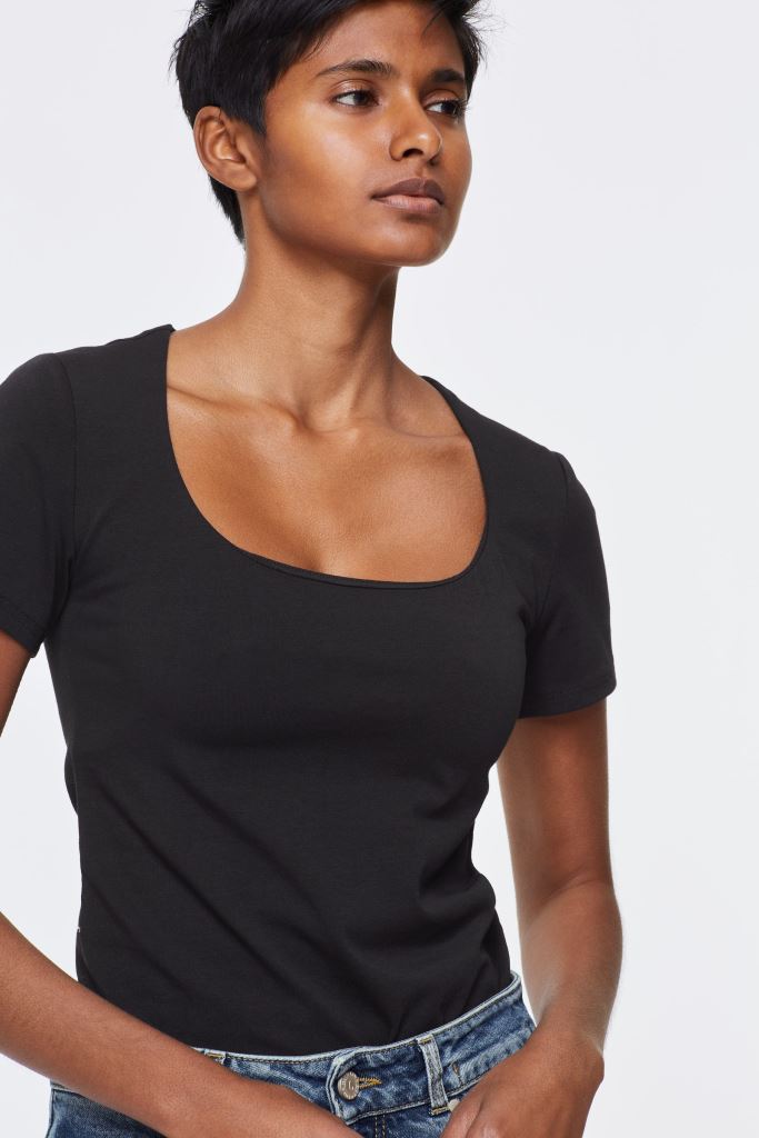 Базова футболка з еластичної бавовни з глибоким круглим вирізом.