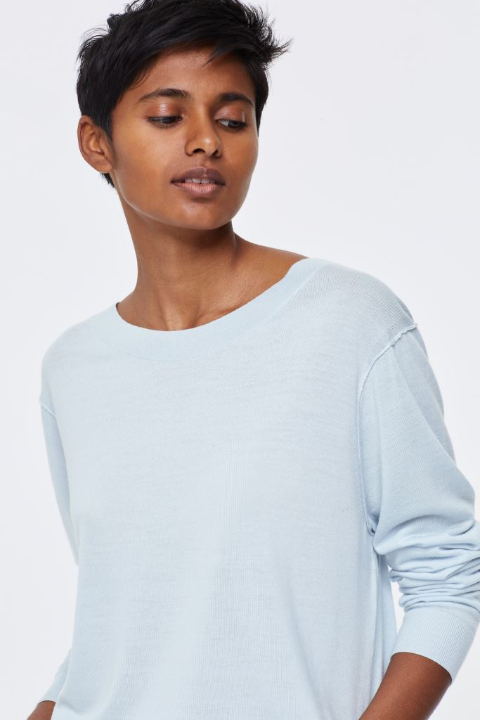 Джемпер з мериноса і шовку. Має горловину-човник, виріз якої можна носити злегка спущеним на плечі. Закруглений поділ на передній частині.