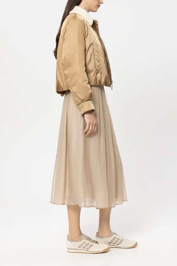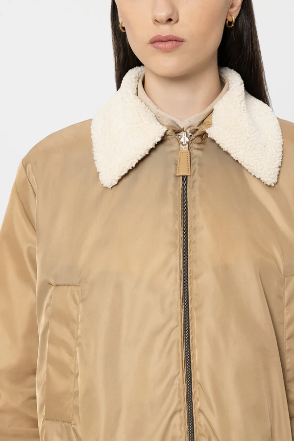 Двостороння куртка-блузон з м'якого, злегка переливчастого атласу для активного відпочинку, з підкладкою на блискавці спереду, двома бічними кишенями та регульованим низом. Куртка має знімний комір зі штучного хутра та наповнена натуральним пухом. Внутрішня частина простьобана, що дозволяє носити куртку по-різному.