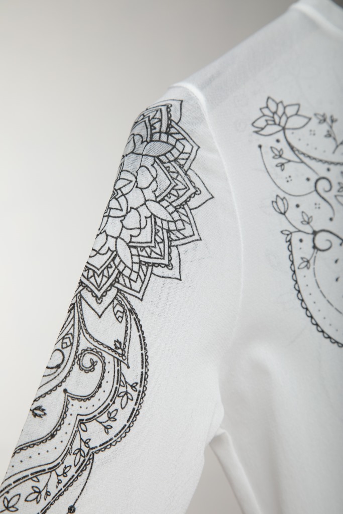 Джемпер з витонченим візерунком, що нагадує мереживний орнамент. Він має облягаючий крій, довгі рукави та круглий виріз горловини.