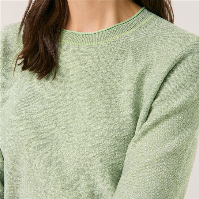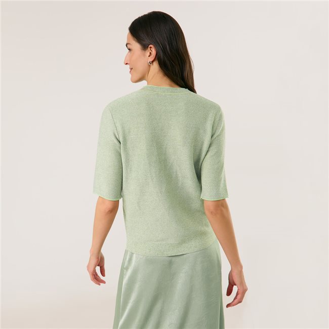 Джемпер має круглий виріз горловини та короткі рукави, що робить його ідеальним для міжсезонного носіння. Модель виконана з м'якої, в'язаної тканини з додаванням люрексових ниток, які надають легкого сяйва. Низ джемпера, манжети рукавів і комір оформлені в рубчик, що забезпечує зручну посадку.
