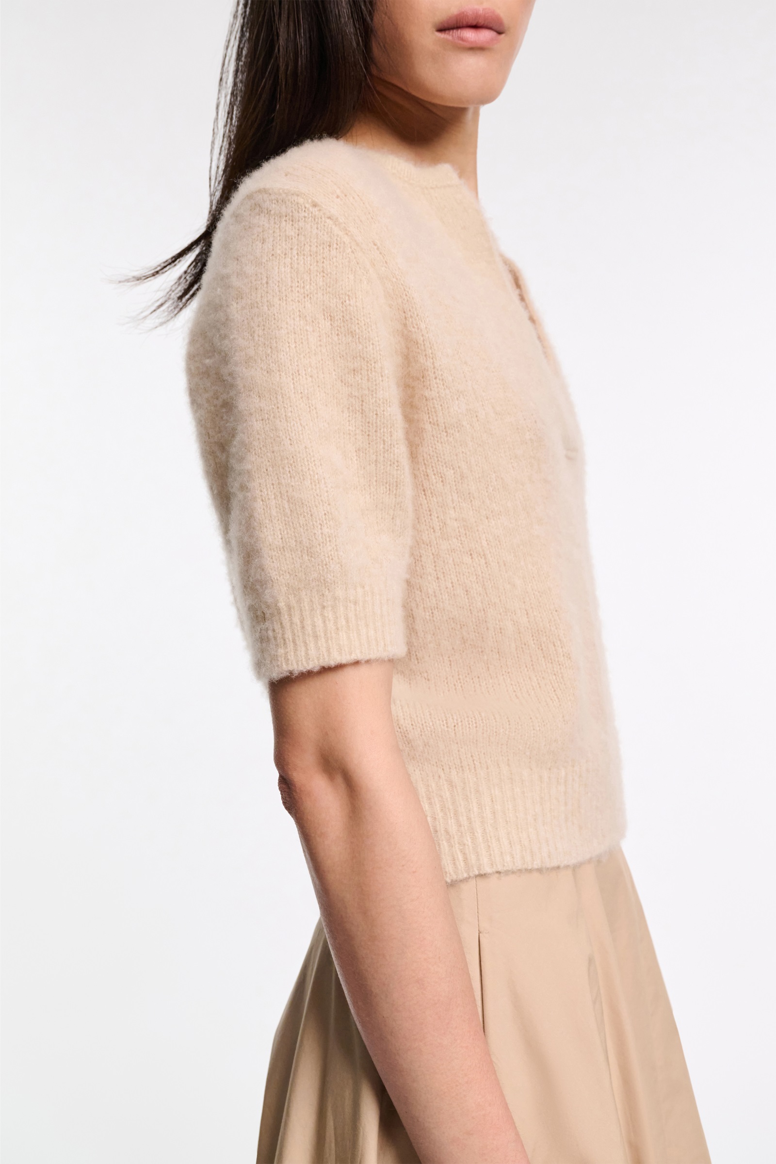 Светр з укороченими рукавами, зв'язаний з нової плюшевої кашемірової пряжі, має відкритий виріз горловини. Манжети та поділ з ребристої в'язки.