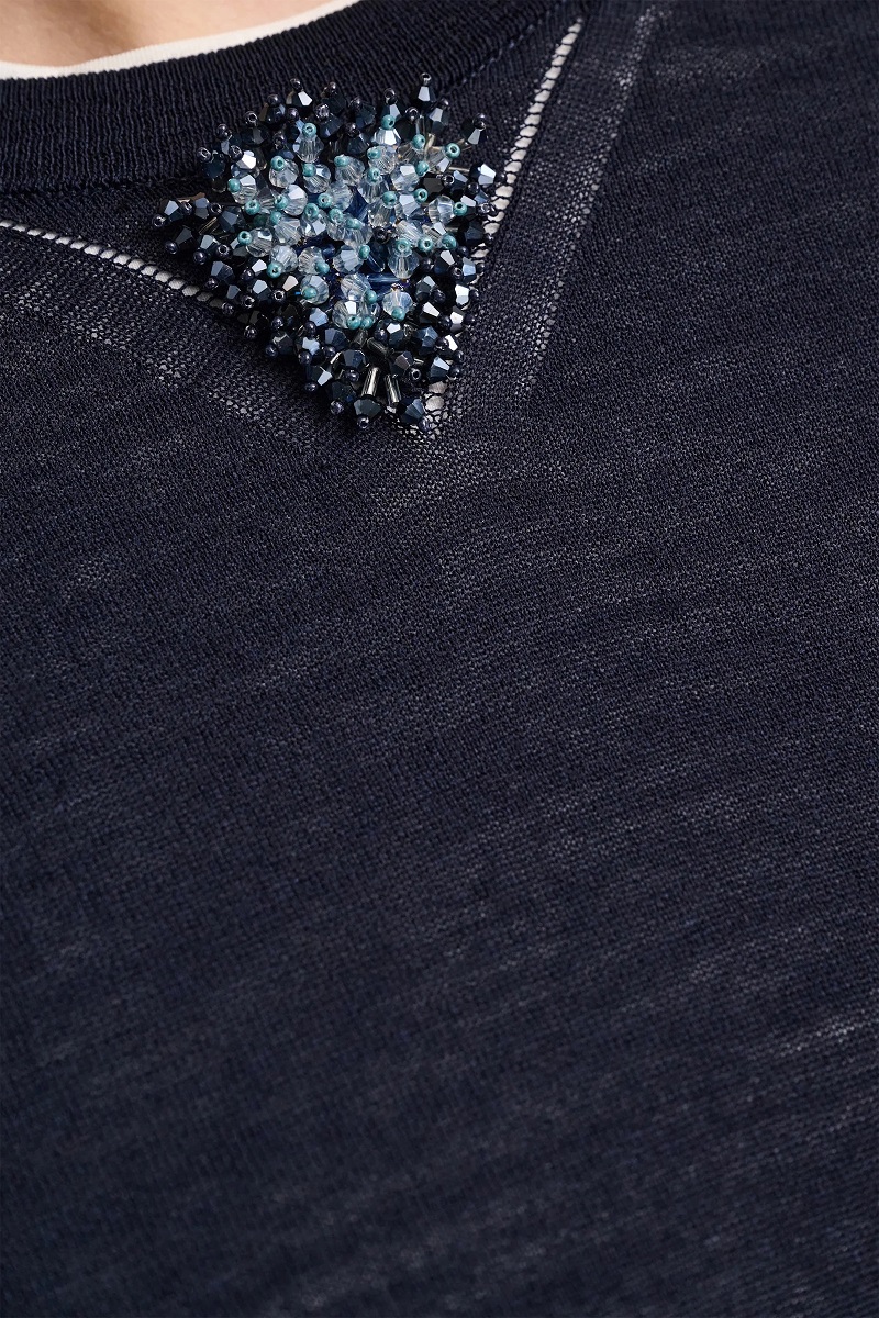 Пуловер з первинної вовни та бавовни має декоративний трикутник з органзи на горловині, оздоблений блискучим скляним камінчиком. Пуловер має розслаблений драпірований верх і рукав 3/4.
