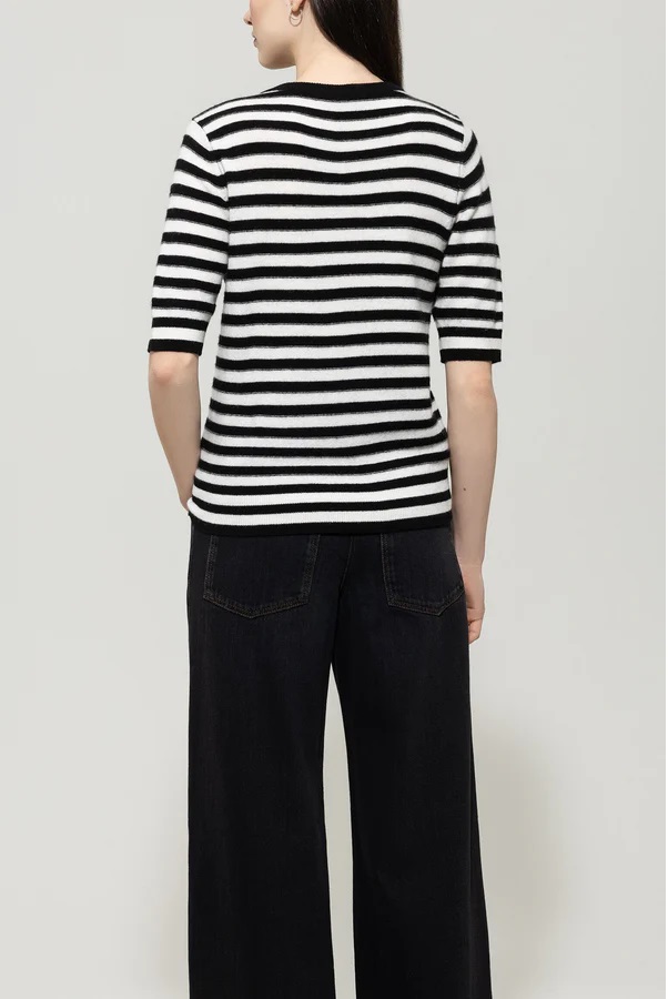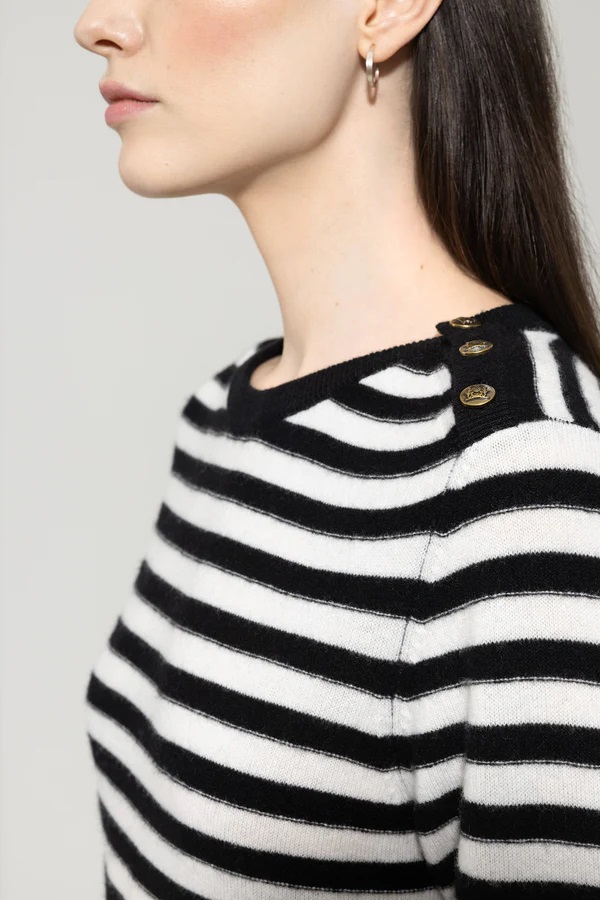 Смугастий светр з елегантного кашеміру з круглим вирізом і ребристими манжетами. Декоровані металеві ґудзики на плечі доповнюють якісний дизайн.
