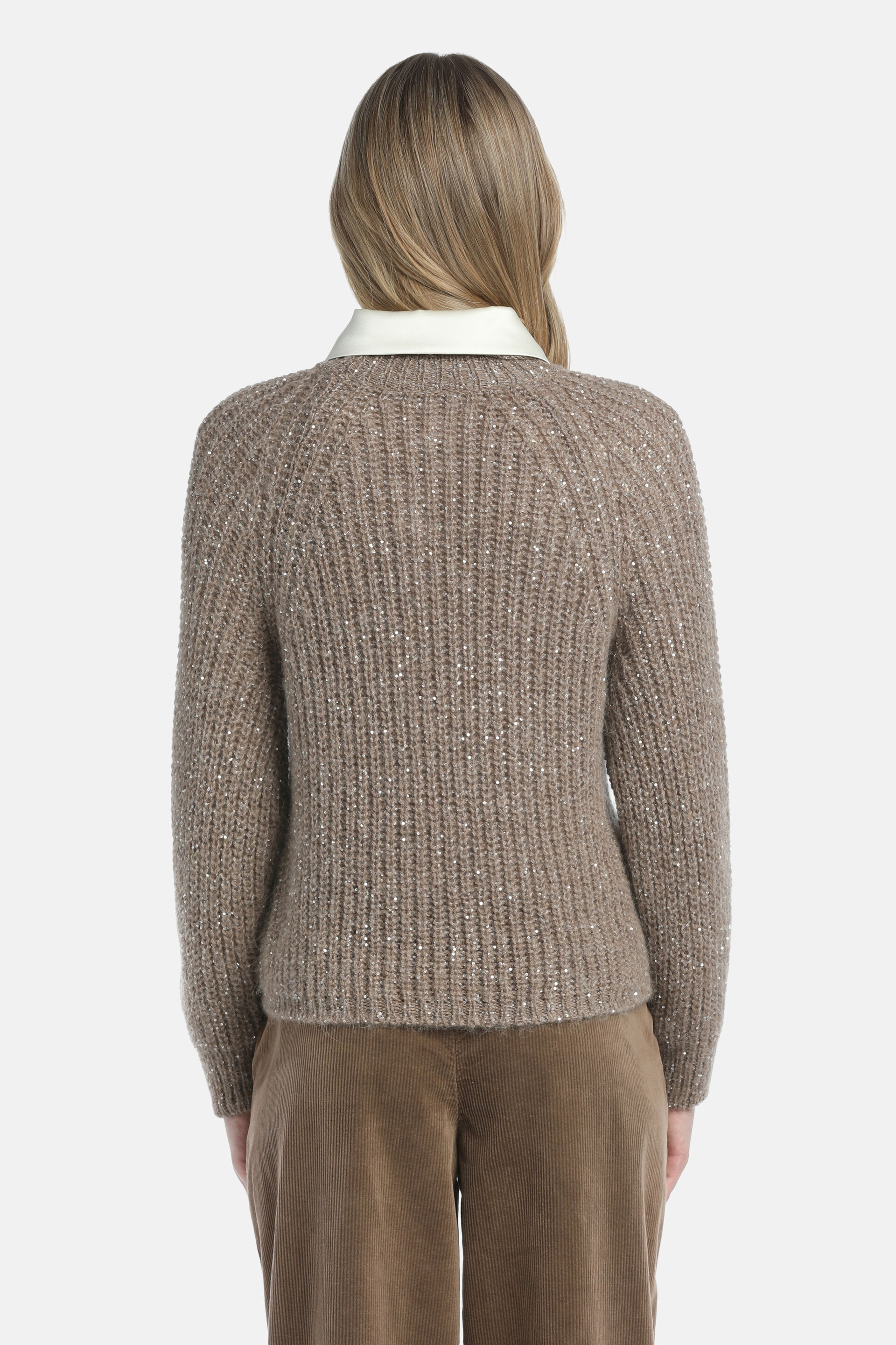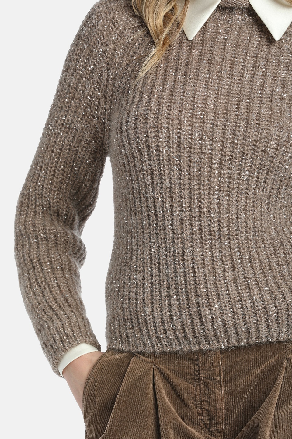 В'язаний пуловер з вовни та альпаки з ребристою фактурою та металізованими нитками люрекс. Комір-хомут. Класичний крій.