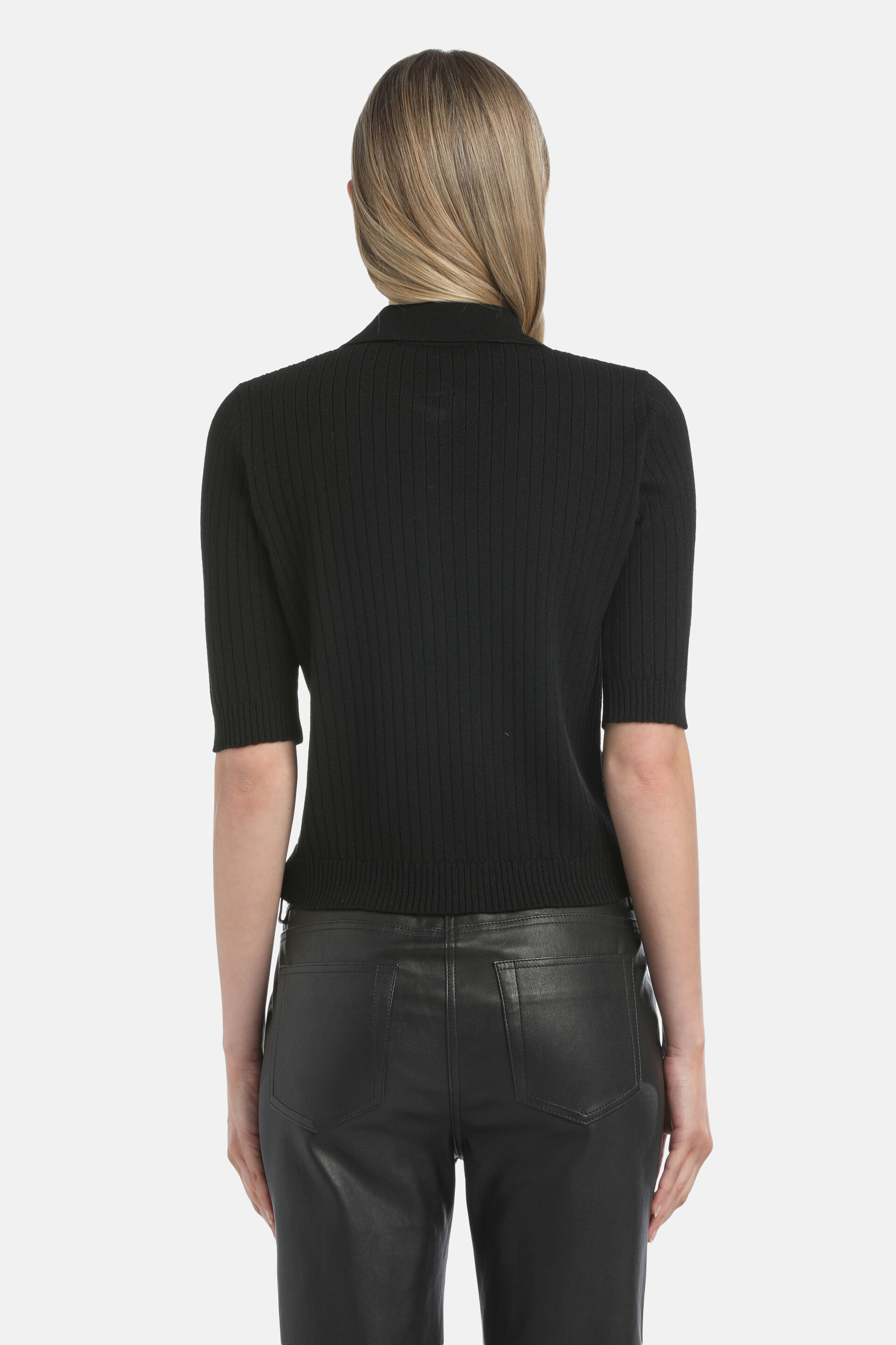 Поло з вовняної суміші з плоским ребристим трикотажем. Гладкий комір, короткі рукави, кнопки в тон. Класичний крій.
