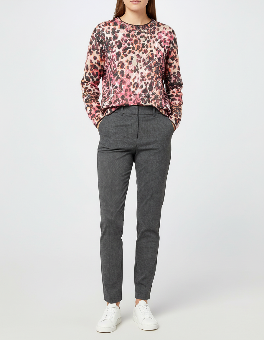 Цей джемпер привертає увагу яскравим леопардовим принтом. Класичний силует із круглим вирізом горловини та довгими рукавами забезпечує зручність і універсальність.