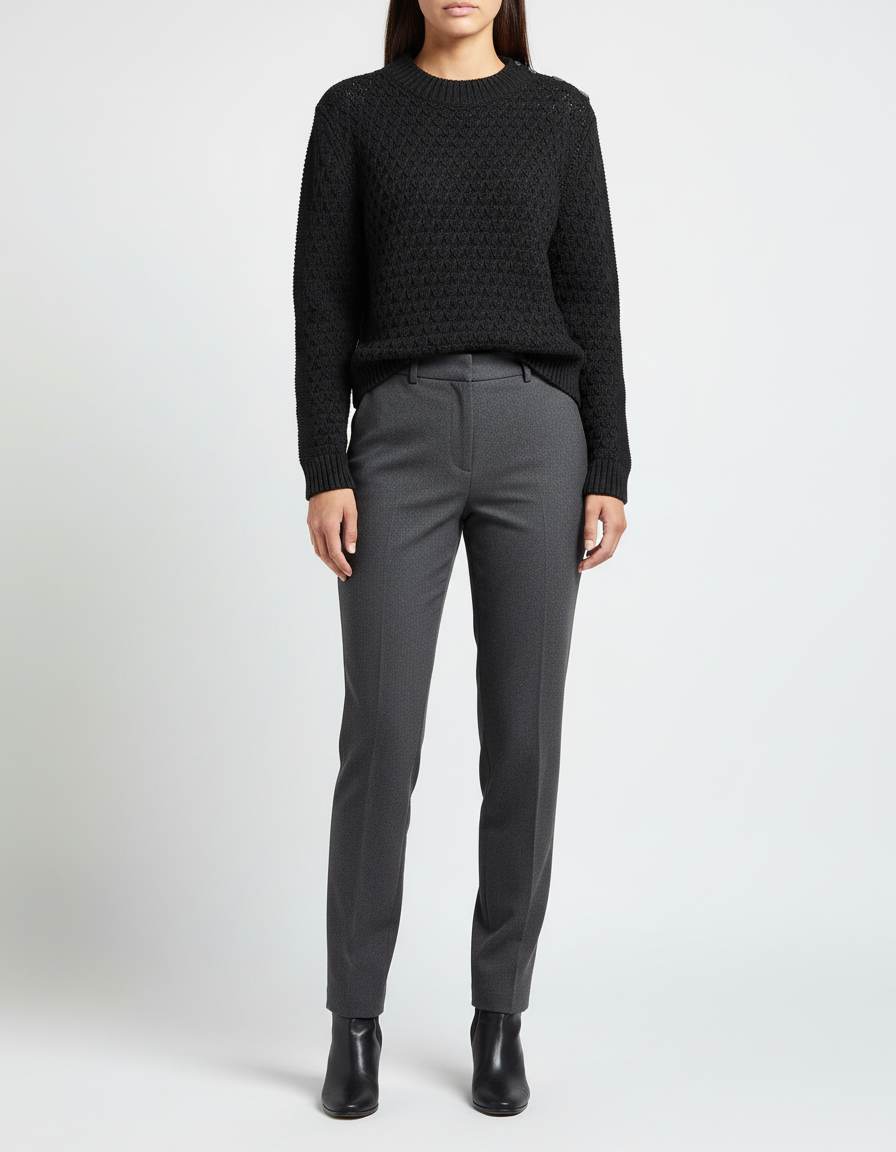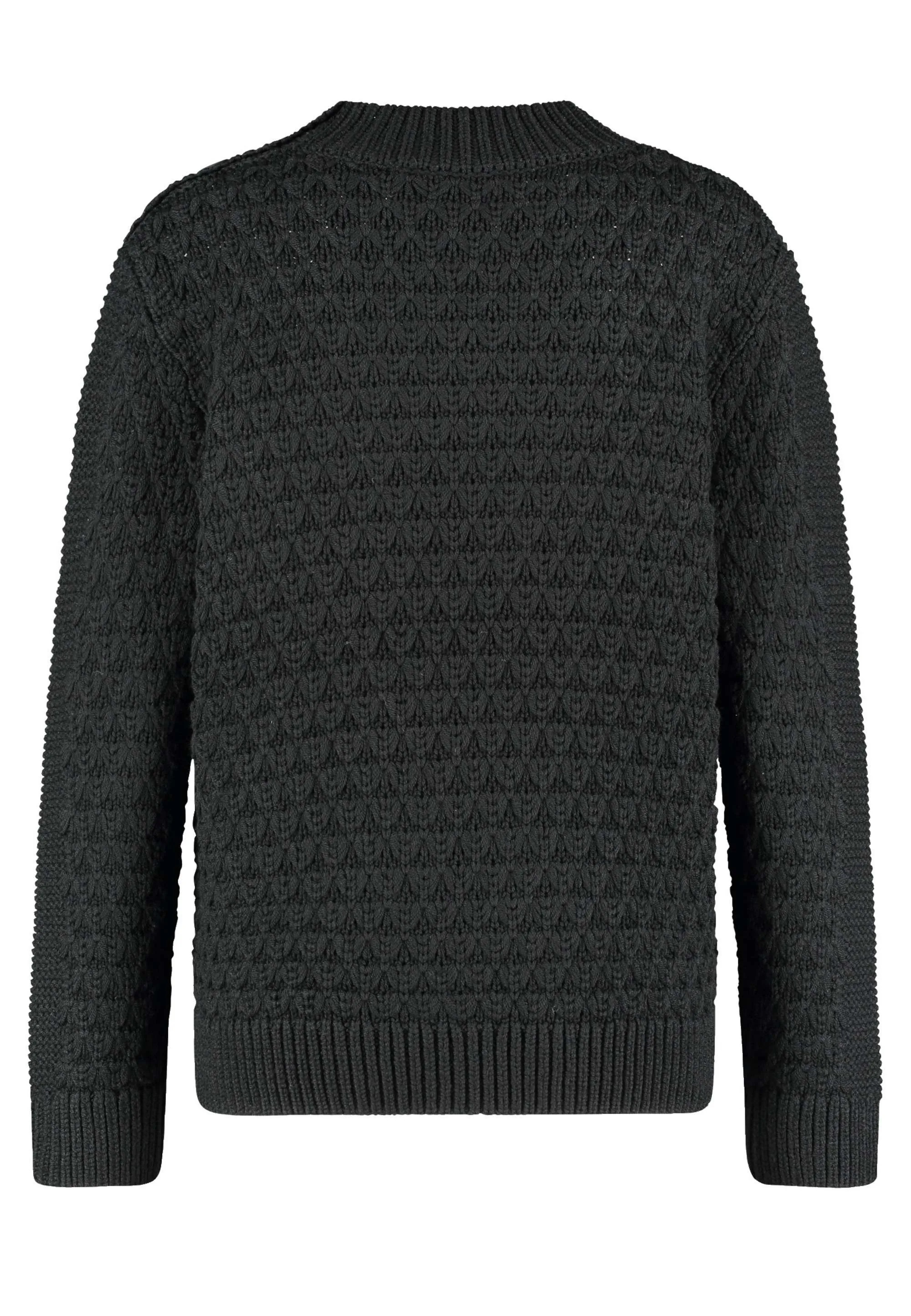 Цей джемпер виконаний із фактурною в’язкою з геометричним візерунком, що створює стильний та об’ємний ефект. Модель має круглий виріз горловини з щільною резинкою та довгі рукави, забезпечуючи комфорт і тепло.