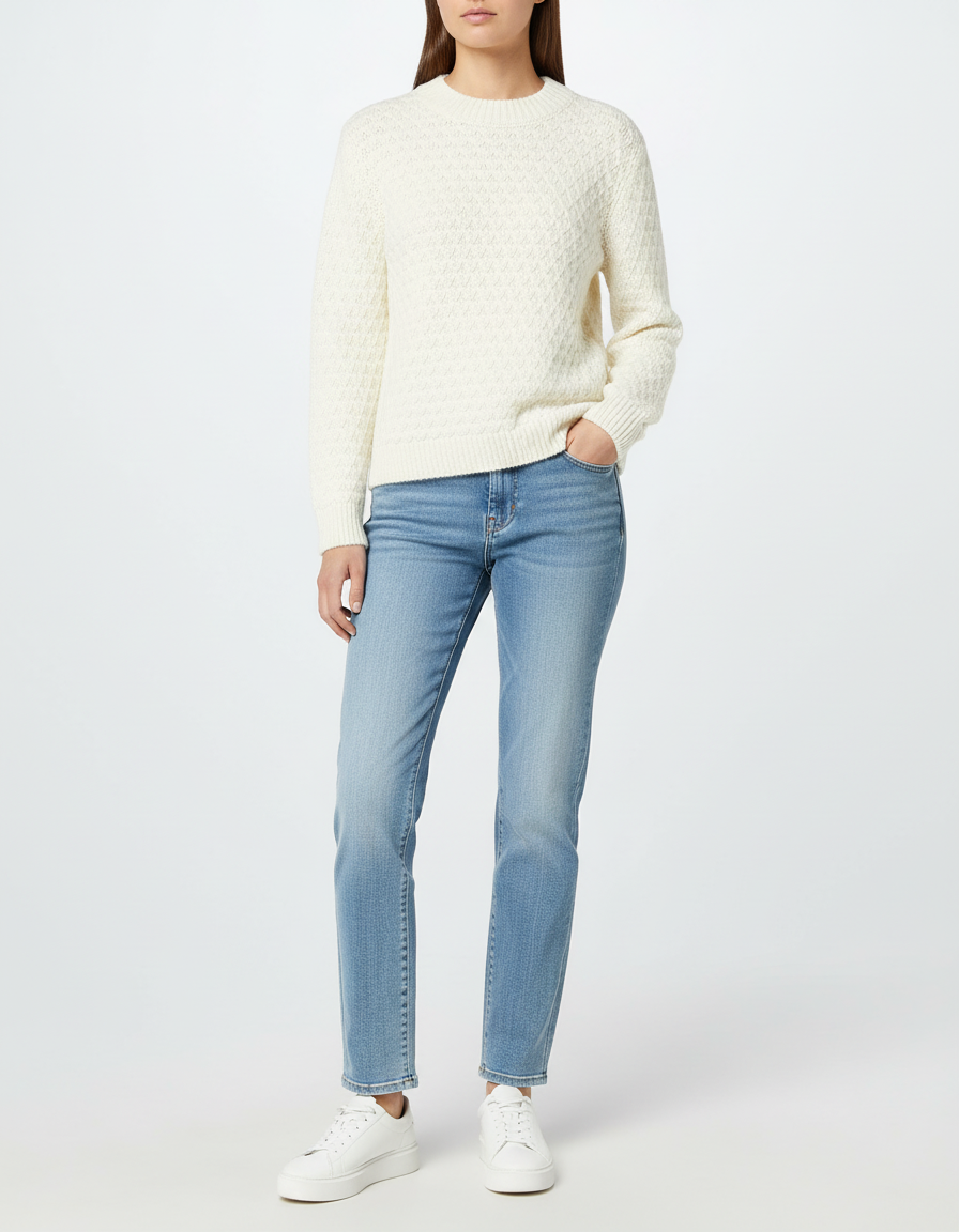 Цей джемпер виконаний із фактурною в’язкою з геометричним візерунком, що створює стильний та об’ємний ефект. Модель має круглий виріз горловини з щільною резинкою та довгі рукави, забезпечуючи комфорт і тепло.