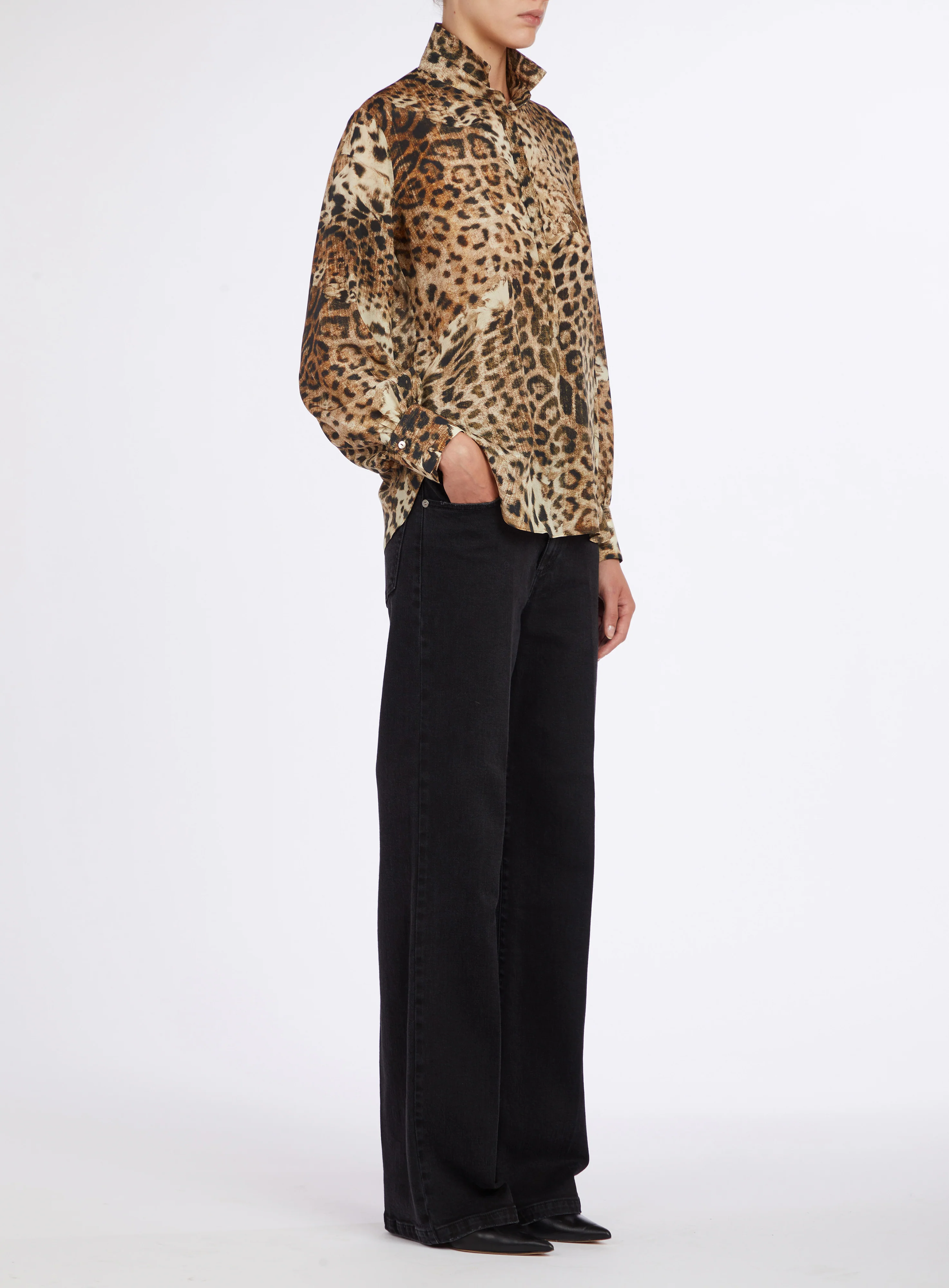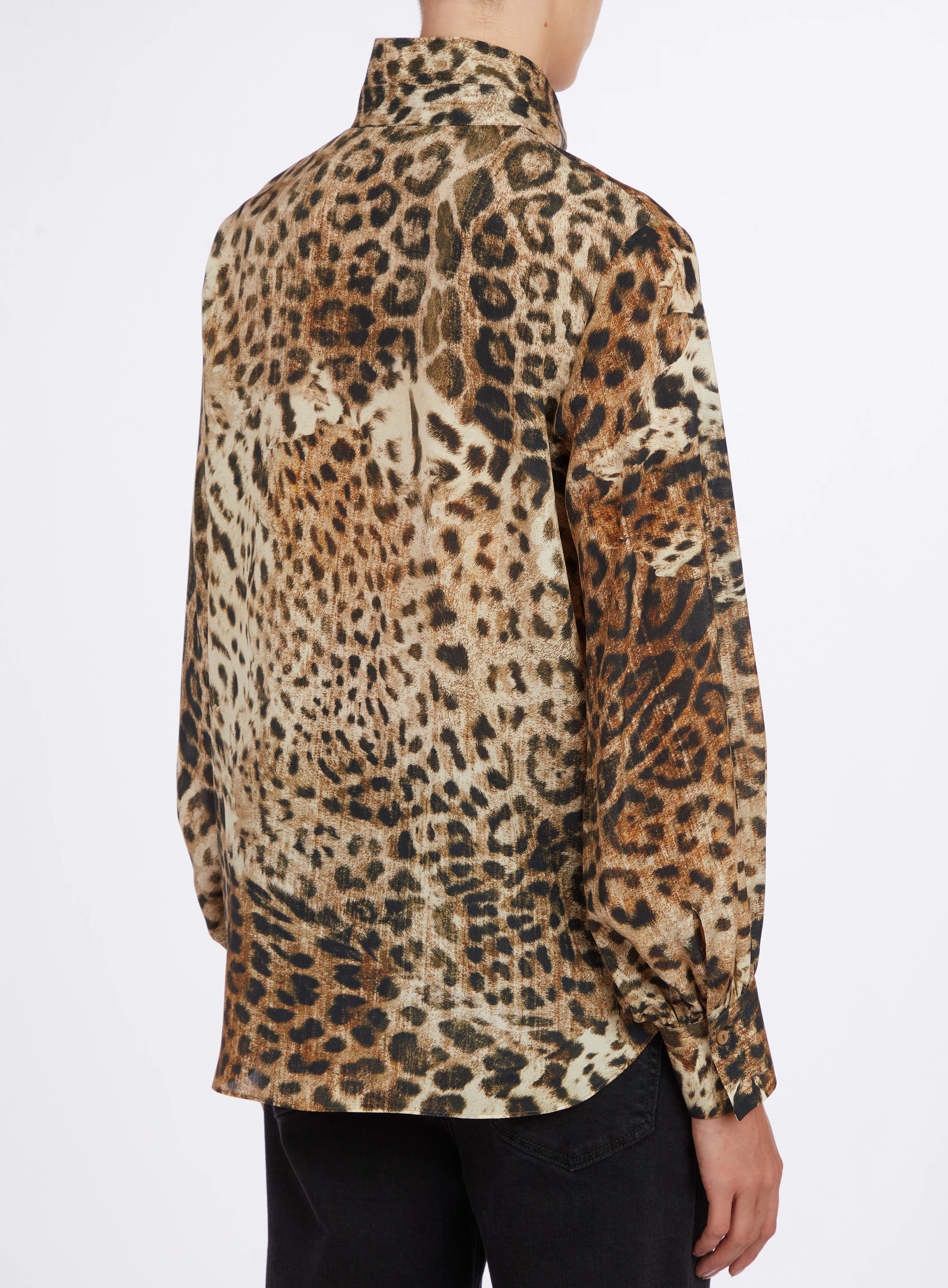 Ефектна шовкова блуза з анімалістичним принтом, яка додає образу впевненості та вишуканої сміливості. Легка гладка тканина приємно лягає по фігурі, забезпечуючи комфорт і бездоганний силует. Модель має класичний крій із коміром та довгим рукавом, що робить її універсальною як для повсякденних, так і для вечірніх поєднань.