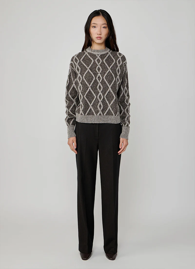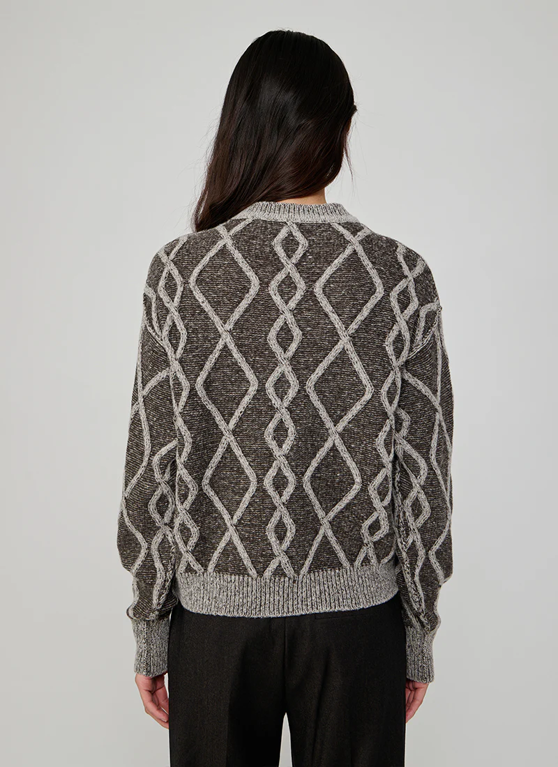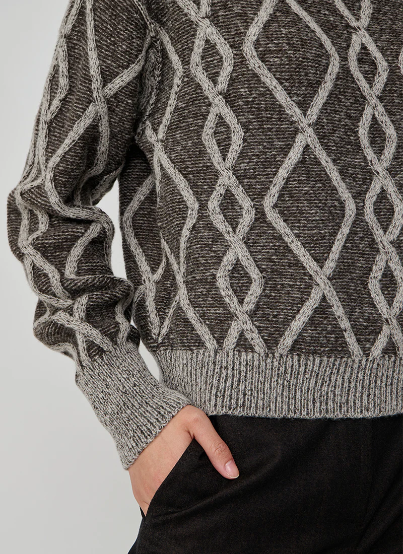 Стильний вовняний джемпер із геометричним об’ємним візерунком, що додає образу виразності та сучасного характеру. Модель має комфортний вільний крій, м’яку круглу горловину та еластичні манжети, які забезпечують ідеальну посадку.