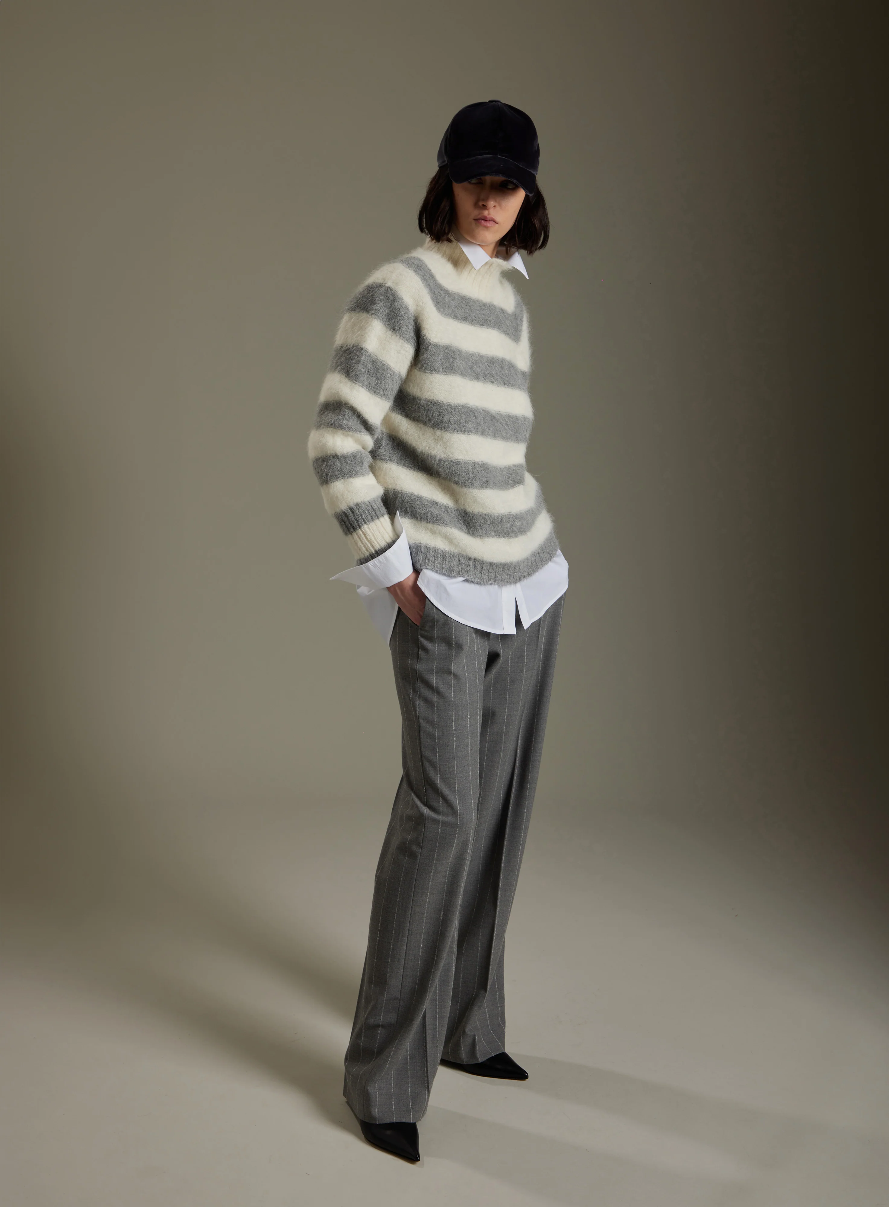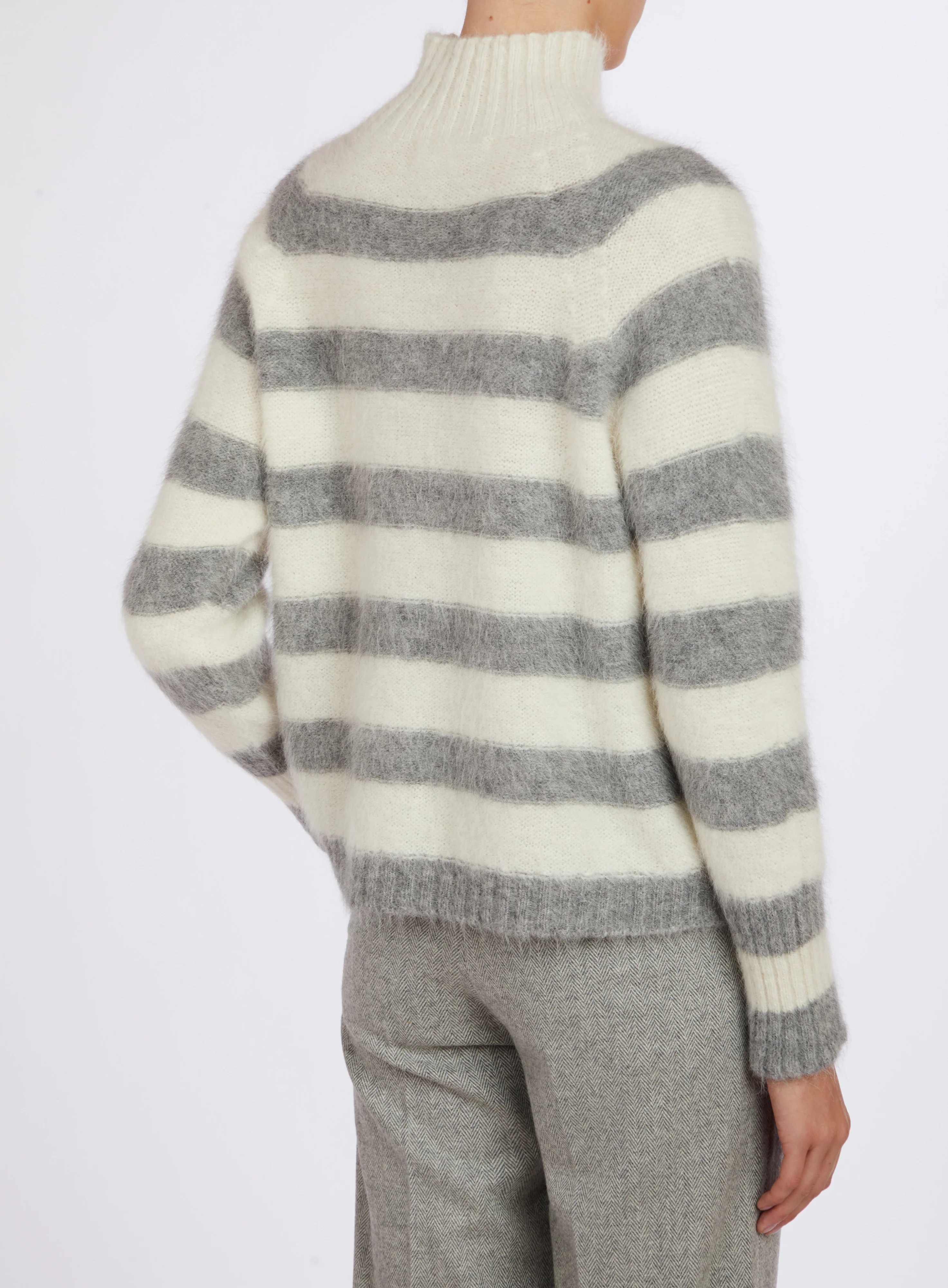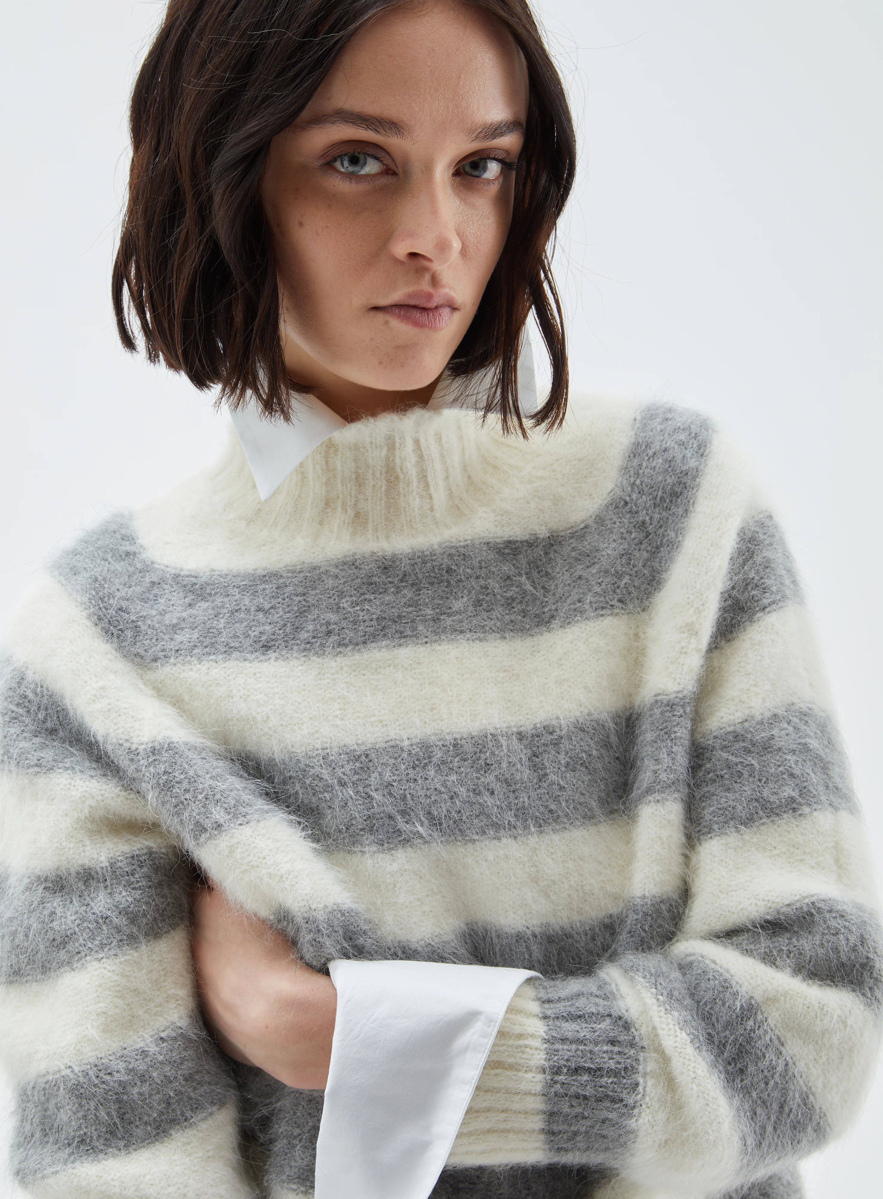 Затишний смугастий джемпер, виконаний із м’якої та легкої пряжі з альпаки. Модель має комфортний вільний силует, м’який комір-стійку та довгі рукави, які забезпечують максимальний комфорт у прохолодну пору року. Ніжна ворсиста текстура та поєднання нейтральних відтінків створюють стильний, сучасний образ.